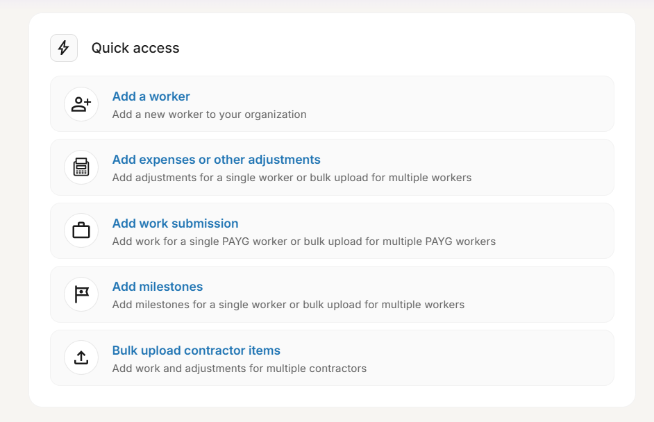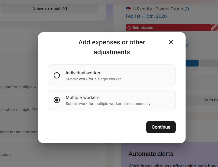 The mass upload can take some time. Clients can leave the page as Deel's platform will notify them when the selected items are uploaded.