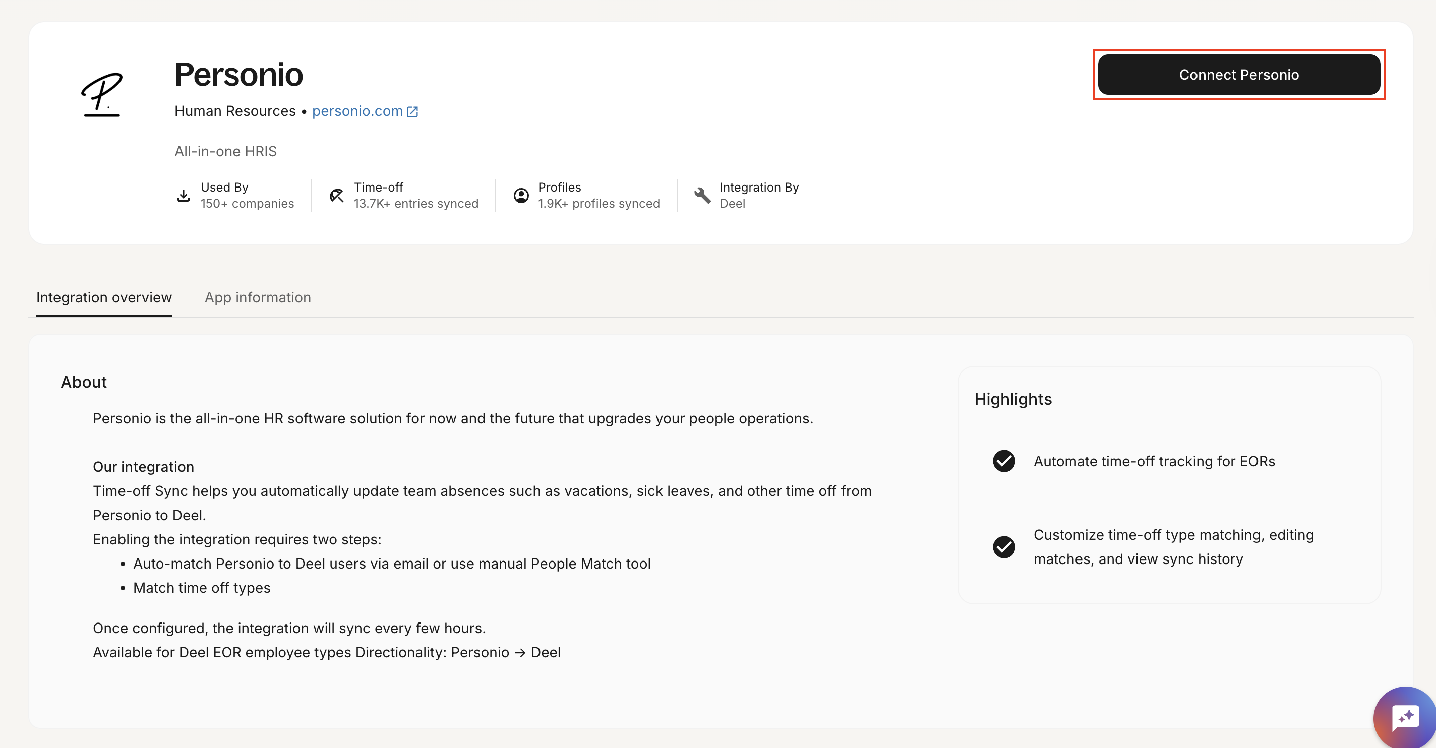 2. On the Personio integration page, click Connect Personio.