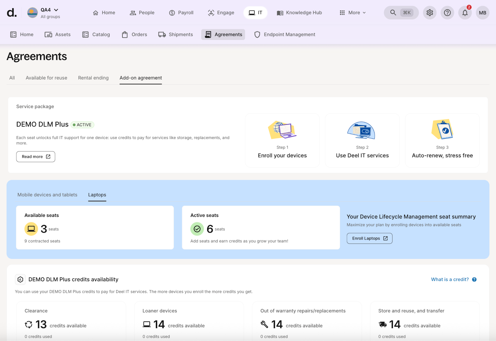 To view your DLM contract breakdown, open the add-on agreements page in your Deel IT platform.