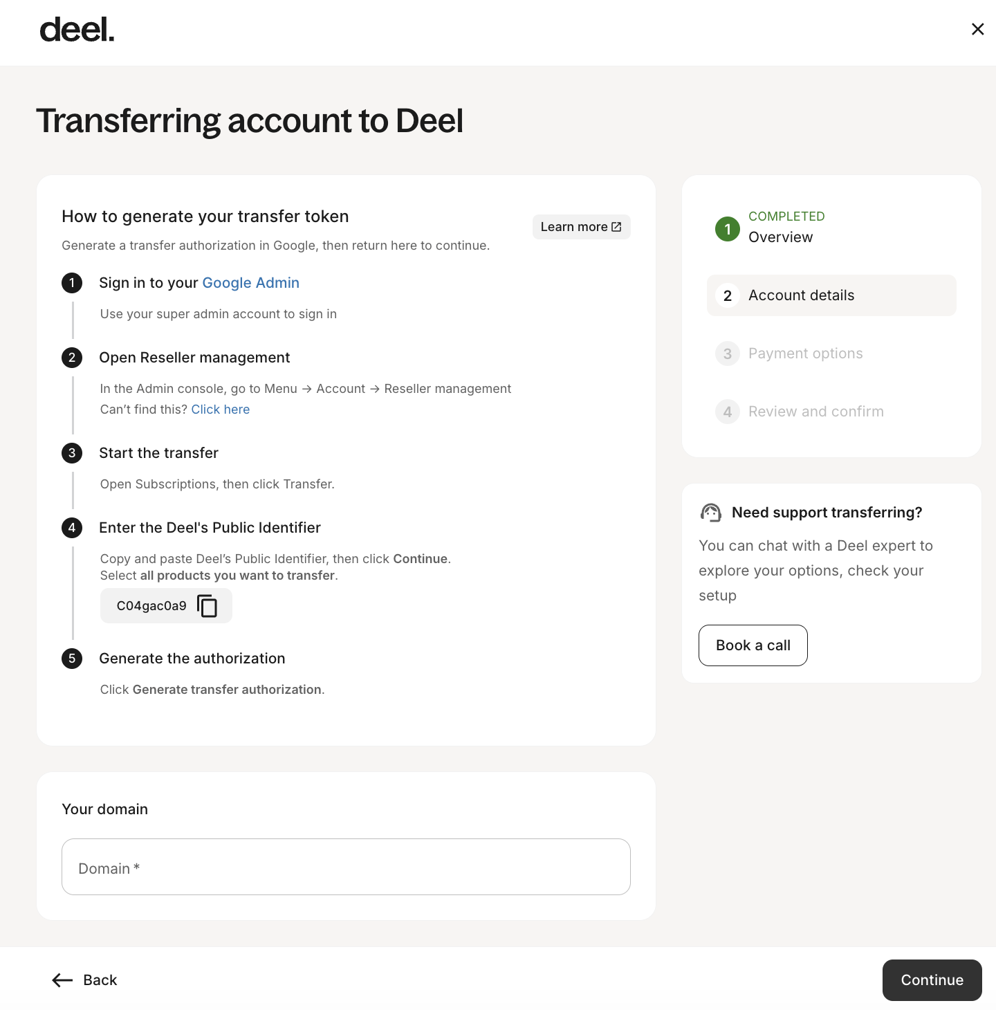 - After generating the transfer token, go back to the Deel flow, add your domain, and click Continue.