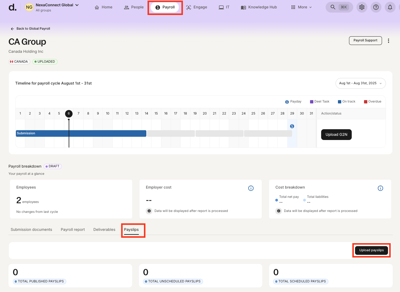Click payslips, select the pay cycle, and then click Upload Payslips