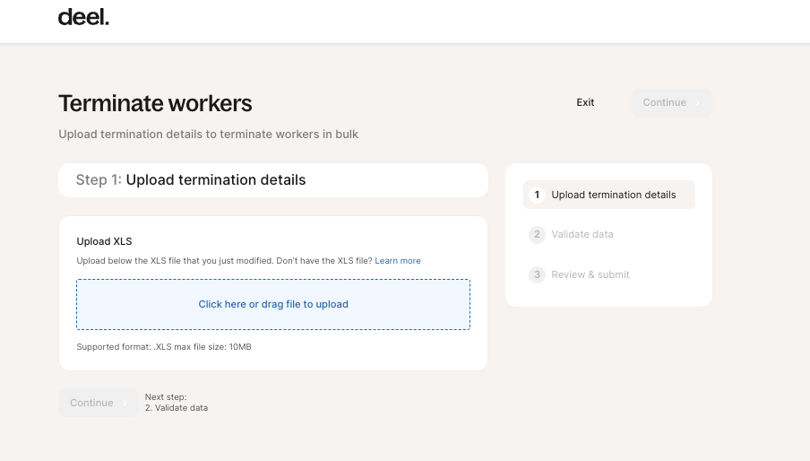 Bulk termination requests can not be scheduled in advance, and Deel will validate the data from your uploaded xls template before processing.