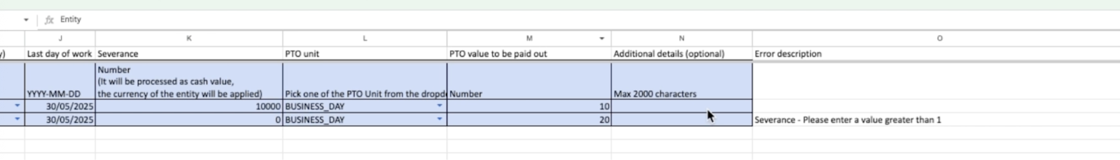 - Error Description: The client can refer to column O for a description of the error and update the corresponding values accordingly.