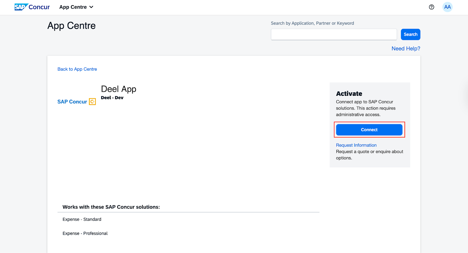 4. In your SAP Concur account, locate the Deel app and click Connect.