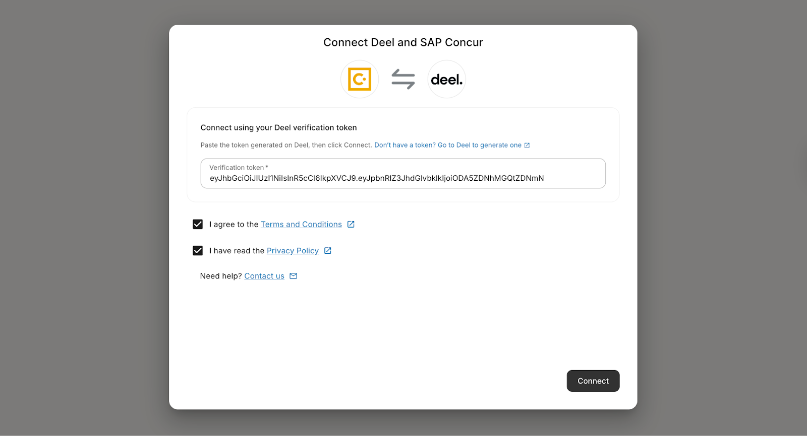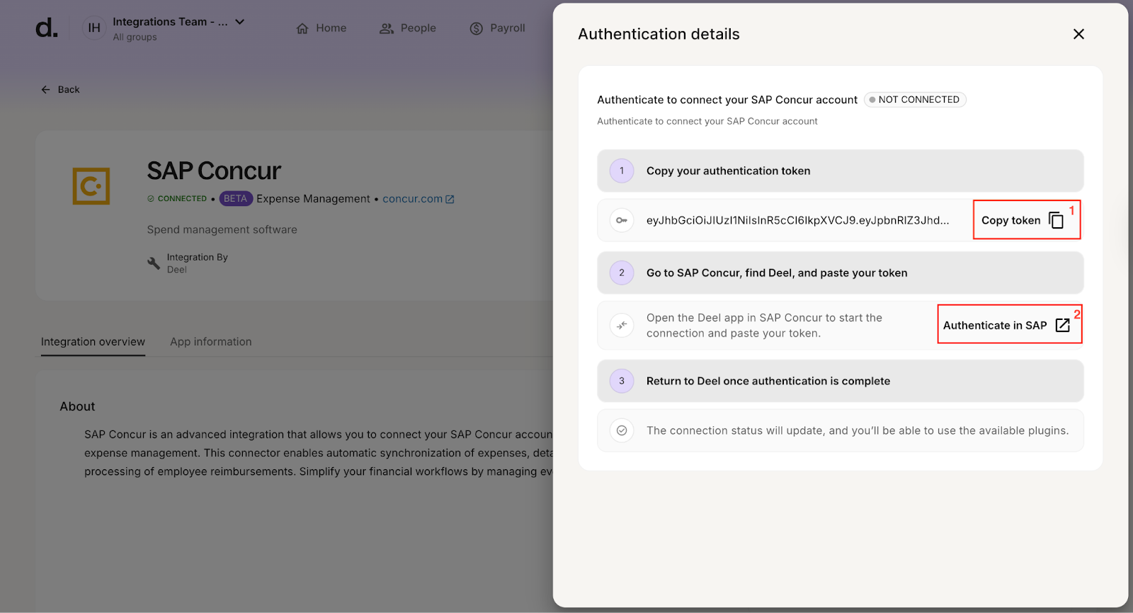 6. In the Deel popup modal, paste the authentication token you copied earlier and click Connect.