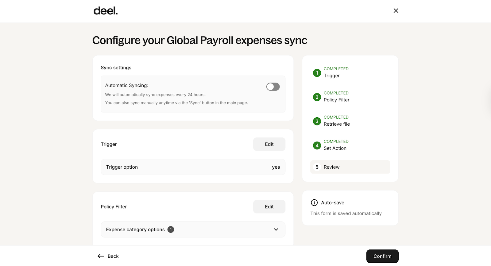 6. On the Review step, verify your configuration settings and click Confirm to complete setup.
