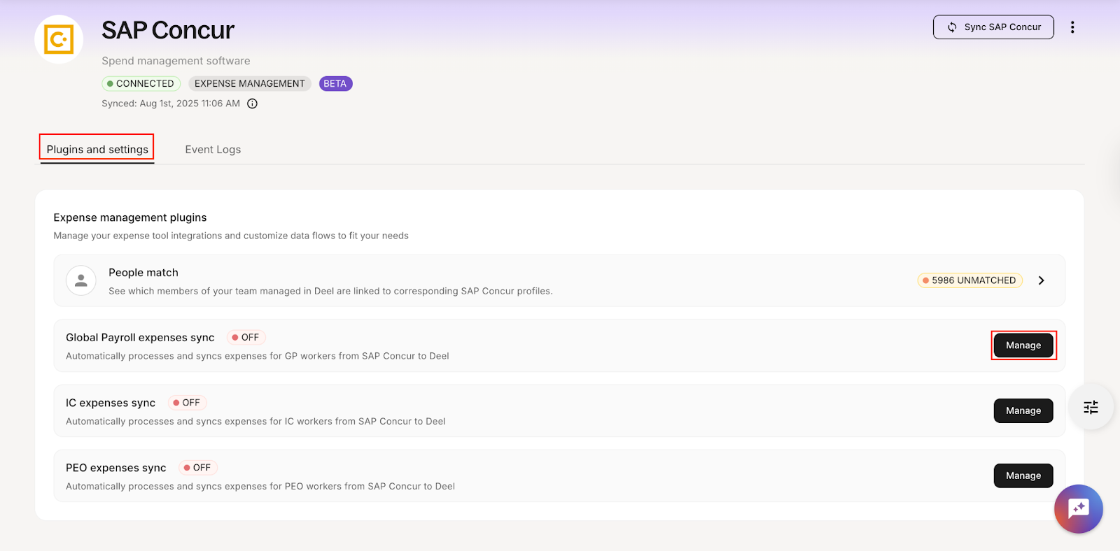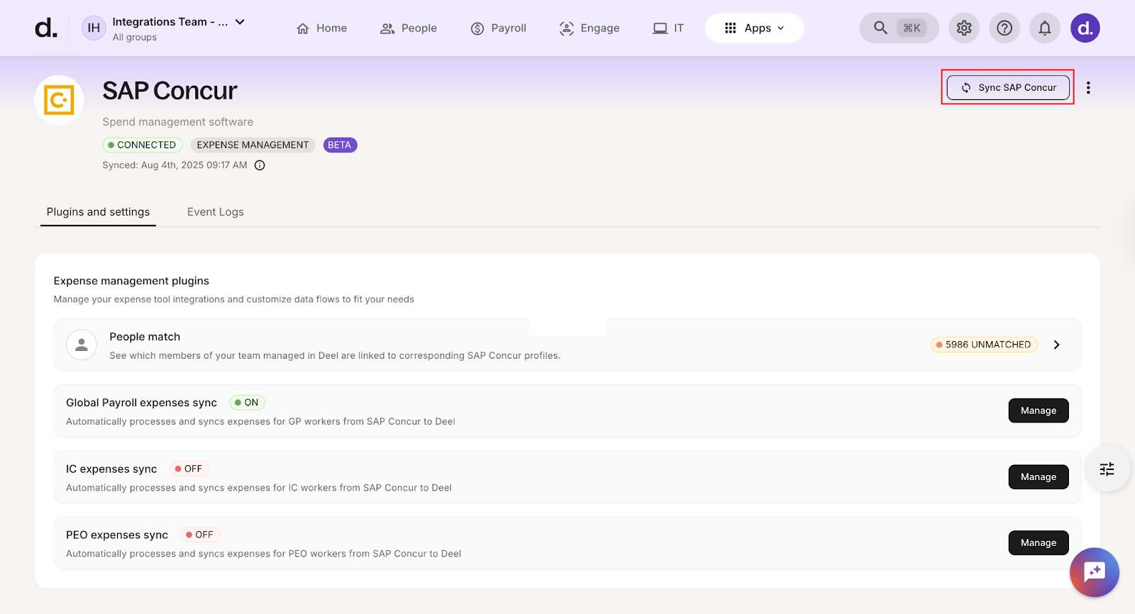 Automatic syncs occur daily, one way from SAP Concur to Deel, but you can manually trigger a sync: