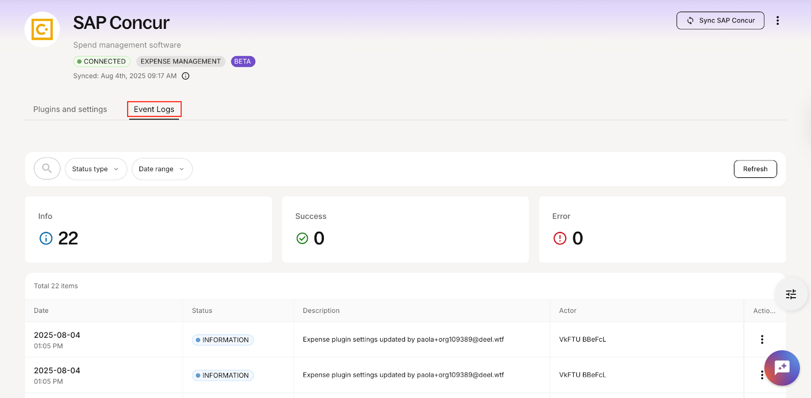 The Event Logs tab provides a detailed record of all activity related to your SAP Concur integration. It helps you track configuration changes, review sync history, and troubleshoot errors.