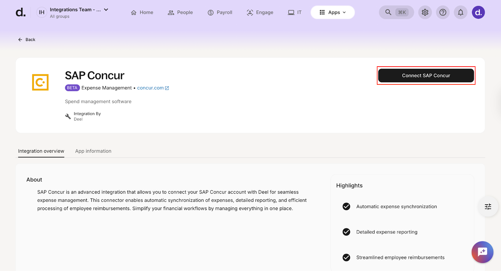 1. In Deel, go to More > Apps and search for SAP Concur.