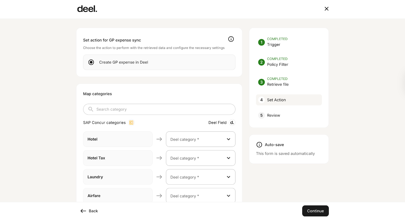 5. On the Set Action step, select how the data should be processed and map field categories between SAP Concur and Deel.