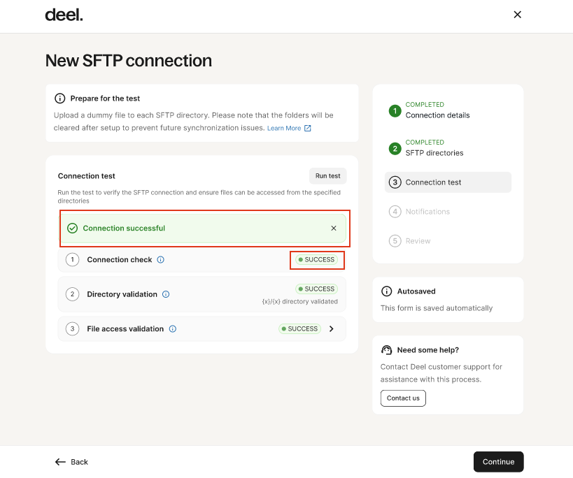 Click the Run Test button to verify the SFTP connection is established and that files can be accessed