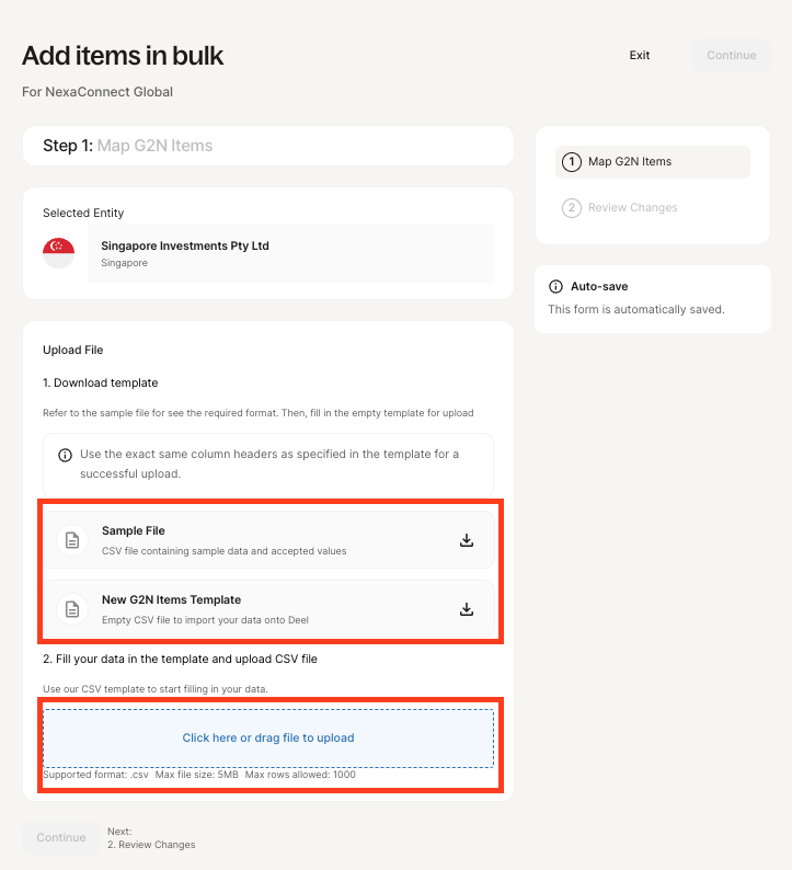 Download the template "New G2N items Template", Fill the template based on your G2N codes & upload.