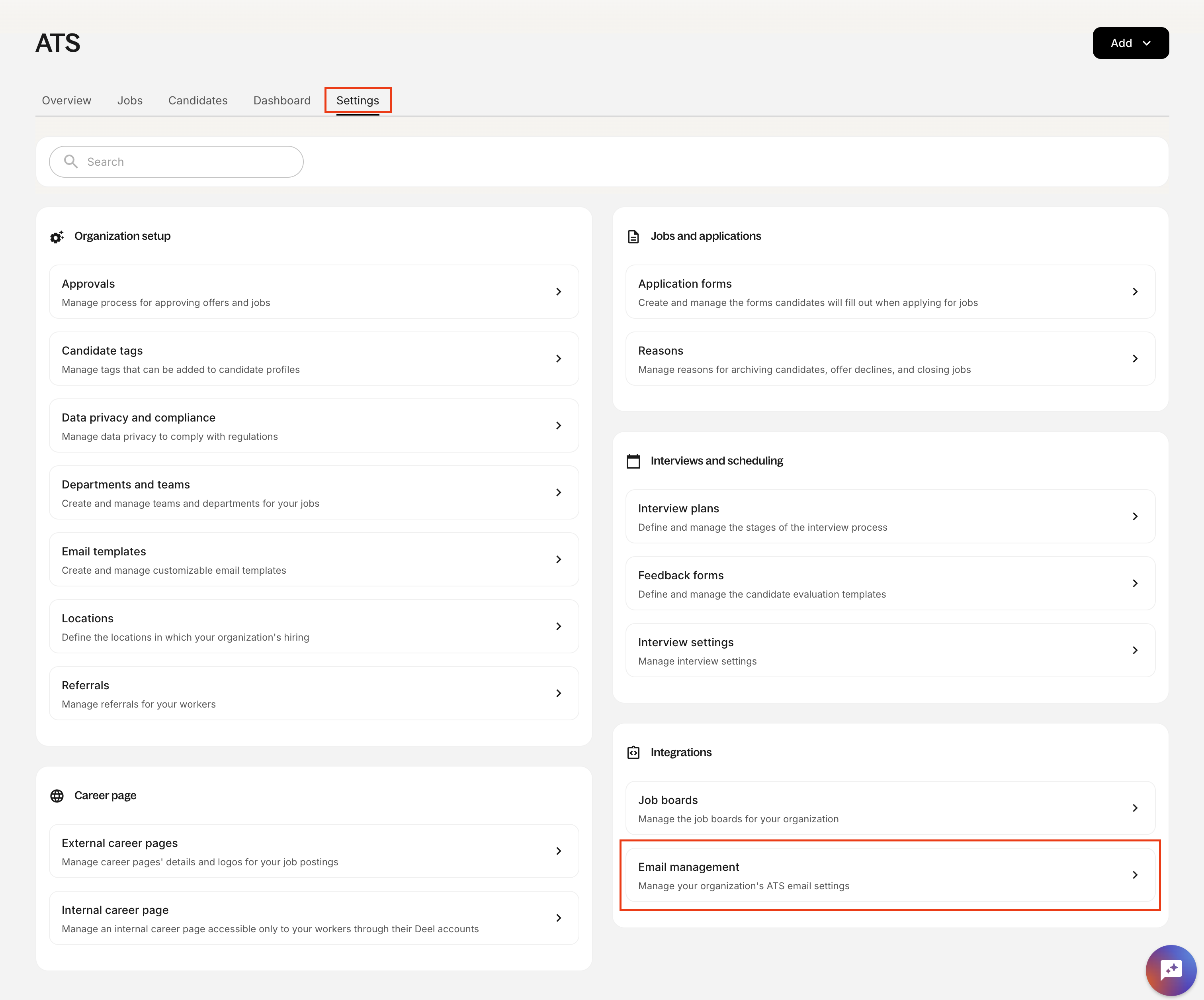 Log in to Deel ATS and go to Settings > Email Management.