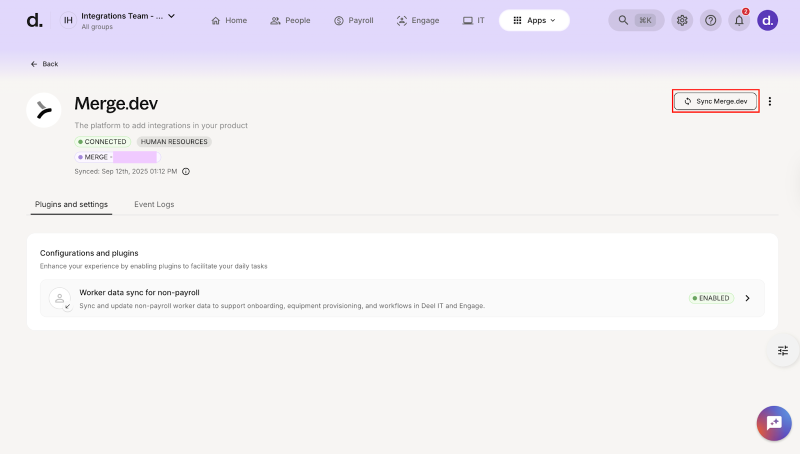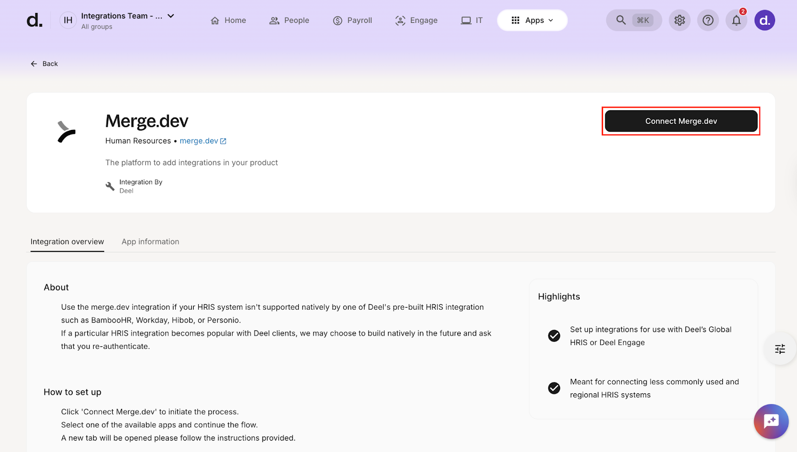 - Go to the Merge.dev integration page on Deel.