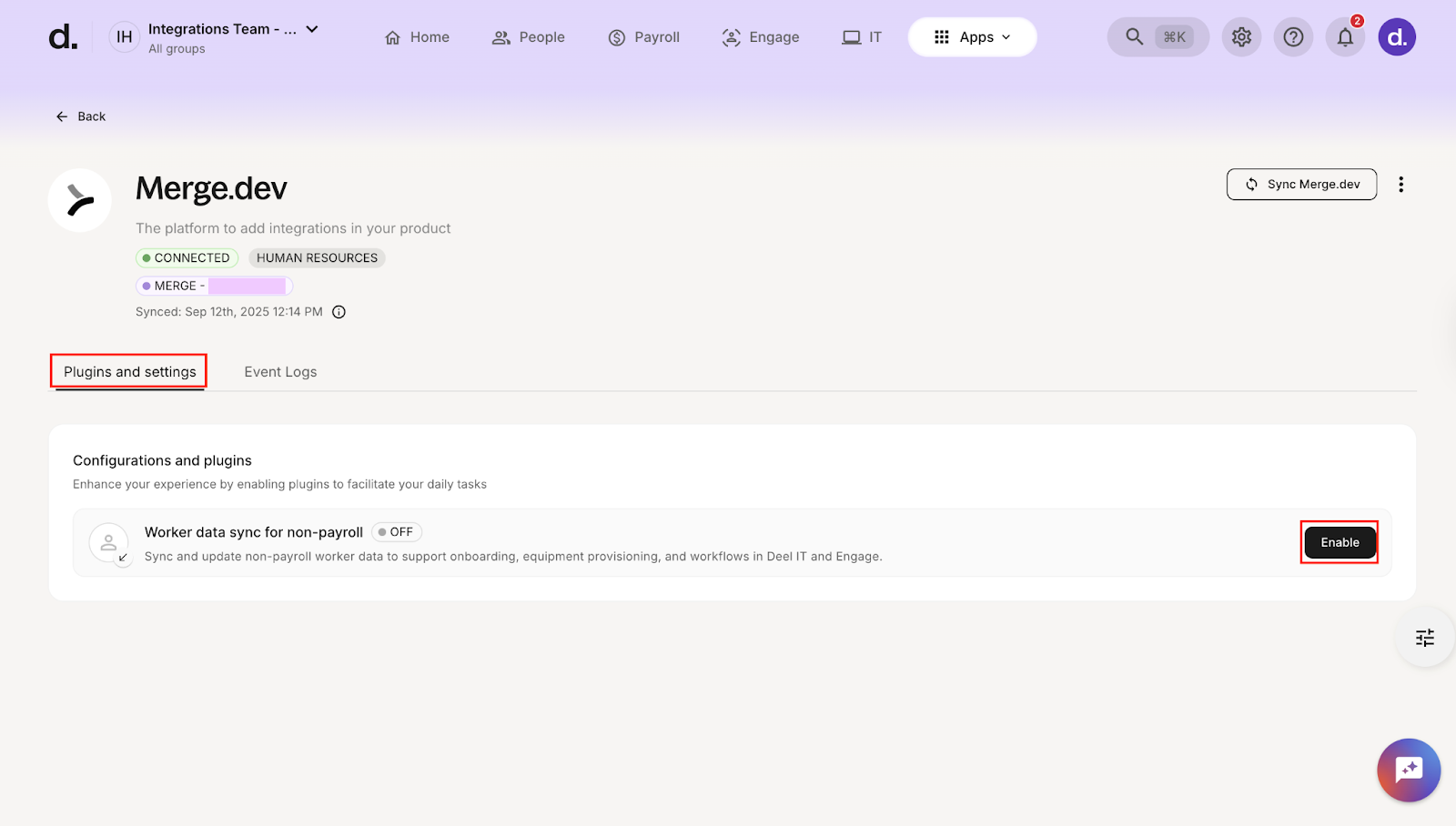 - On the Worker data sync for non-payroll plugin, click Enable.