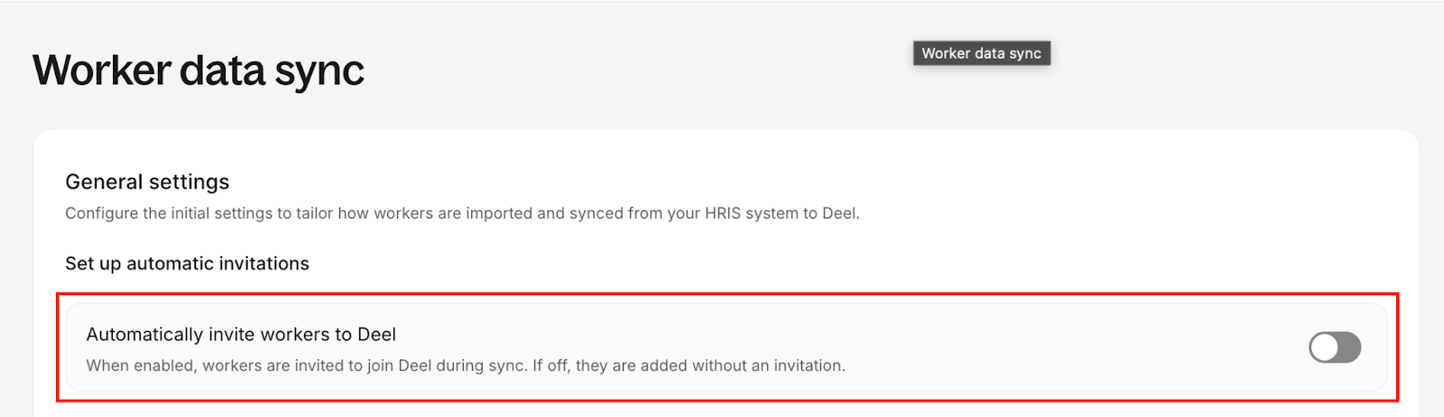 - (Optional) On the Worker data sync page, turn on automatic invitations if you want workers to be automatically invited to Deel.