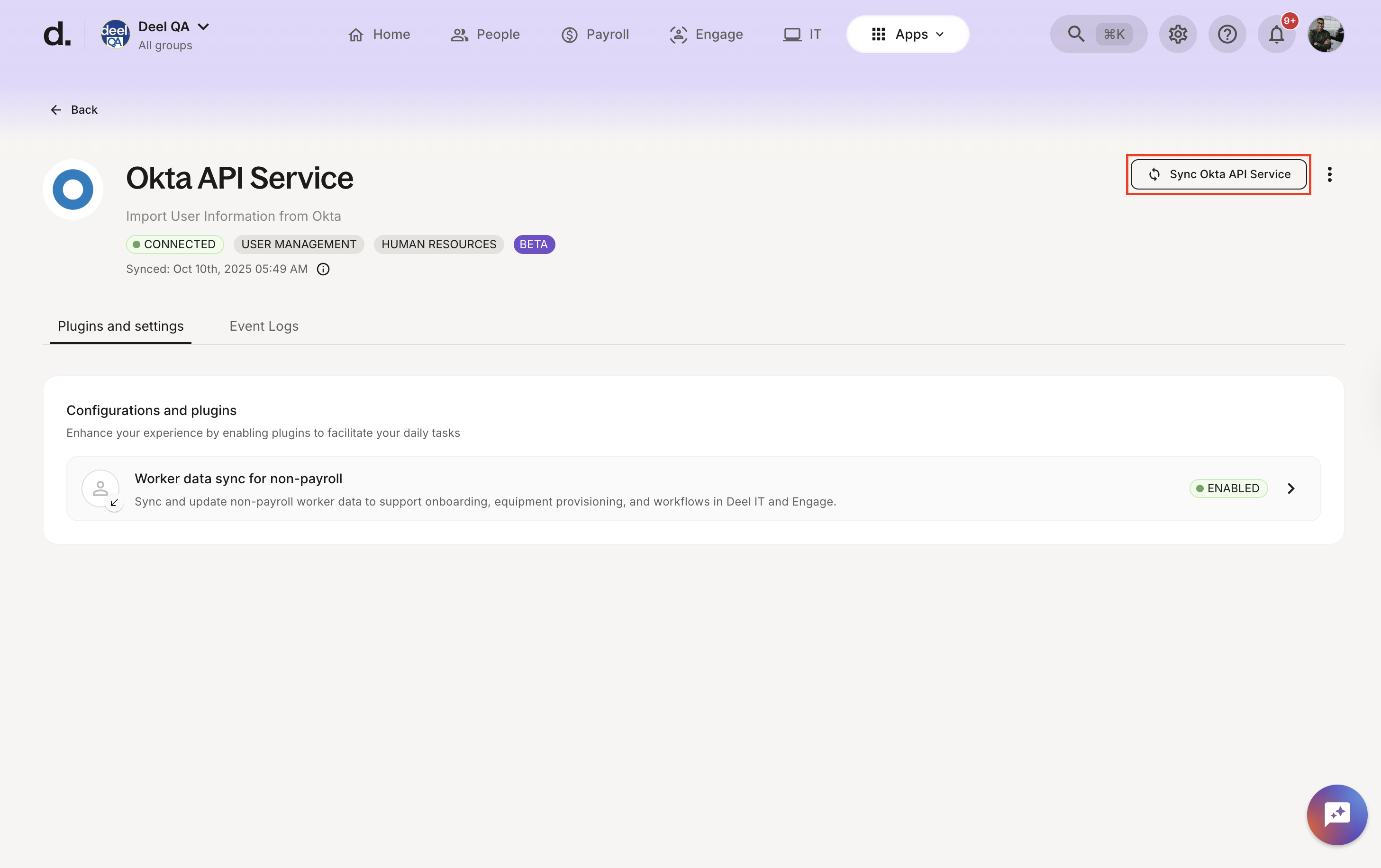 Automatic syncs occur daily, one way from Deel to Okta API Service, but you can manually trigger a sync: