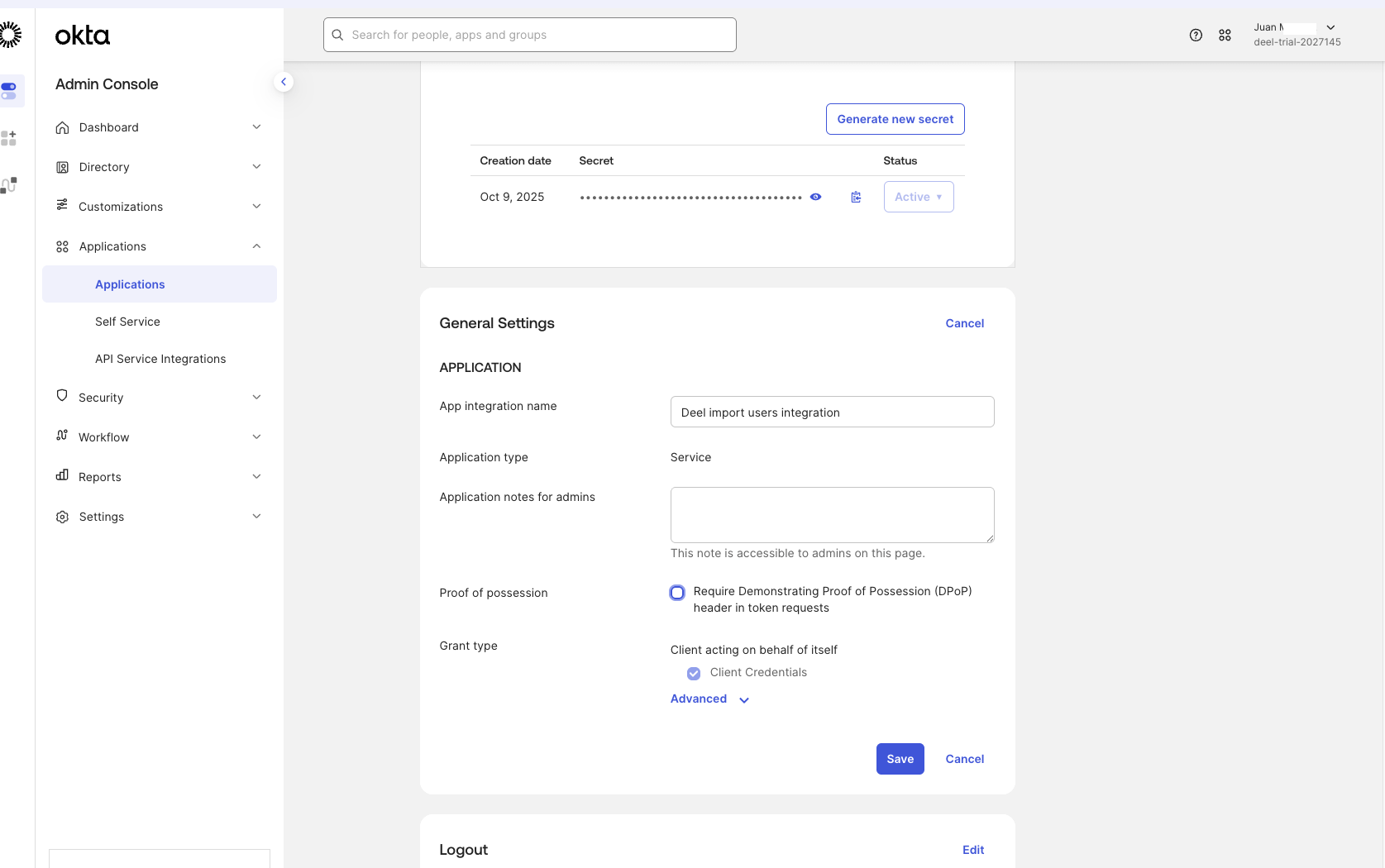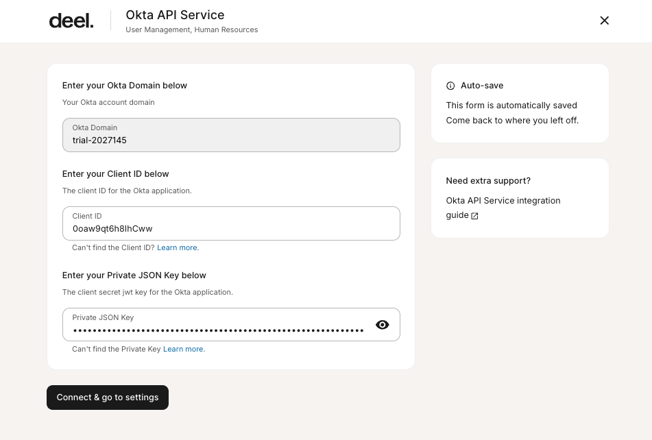To connect Okta API Service to Deel, you’ll need to enable permissions and prepare your account credentials — including the domain URL, client ID, and private JSON key.
