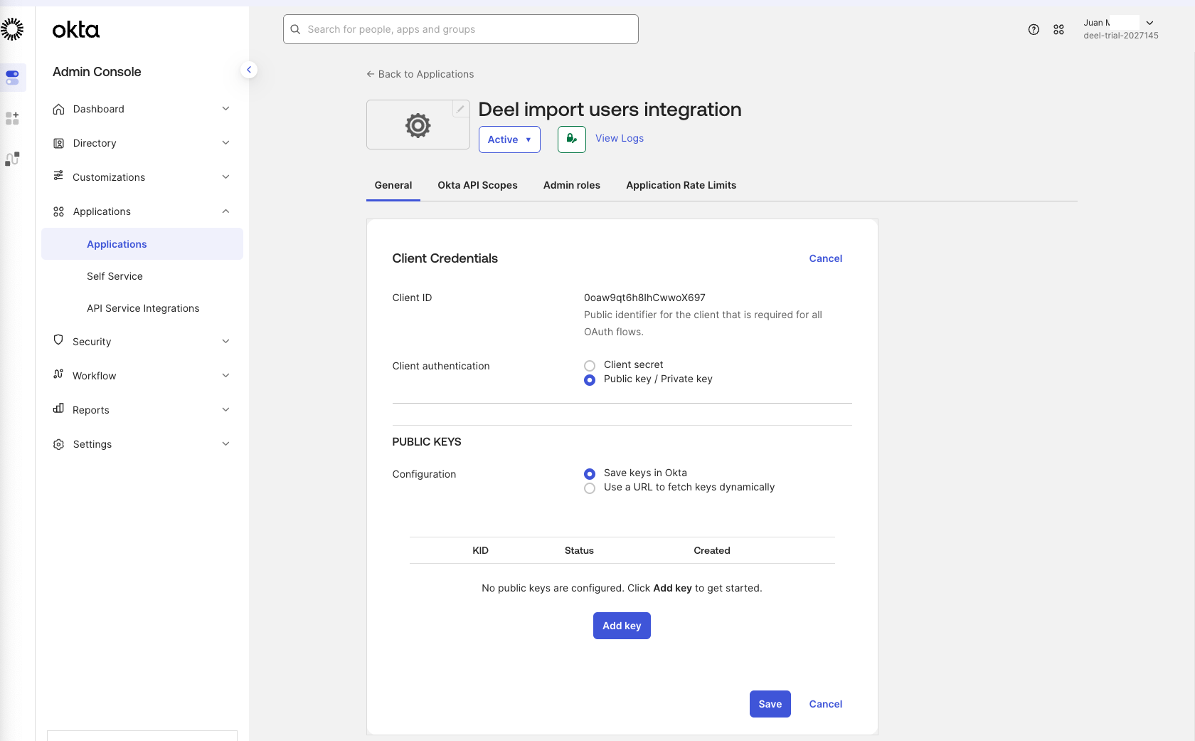 After enabling the Okta API Service permissions, you need to get your Client ID and Private Key.