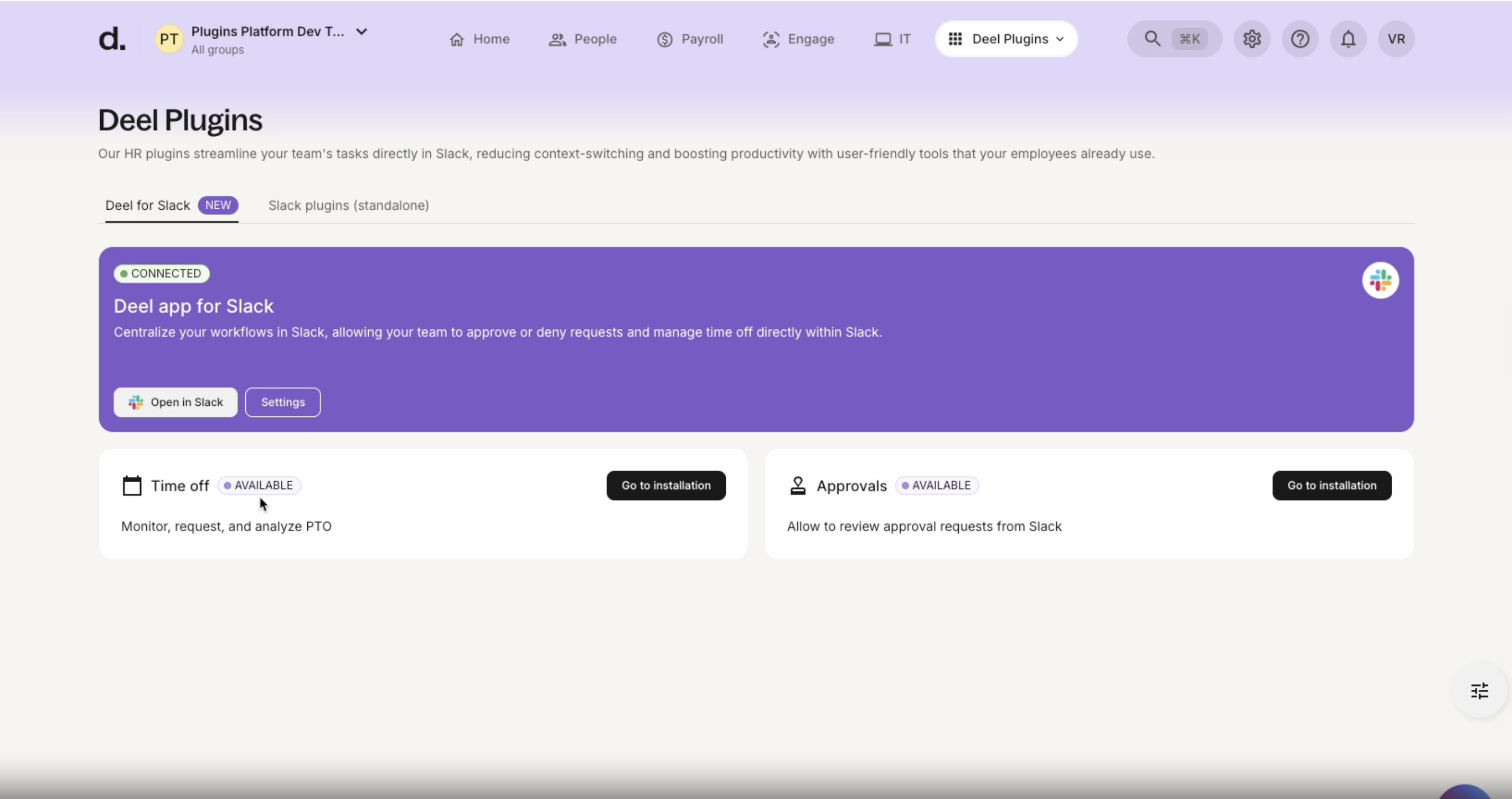 After connecting your Deel Plugins and integrating Slack, you can install additional plugins, such as Time Off and Approvals, to help teams manage requests and workflows directly in Slack.