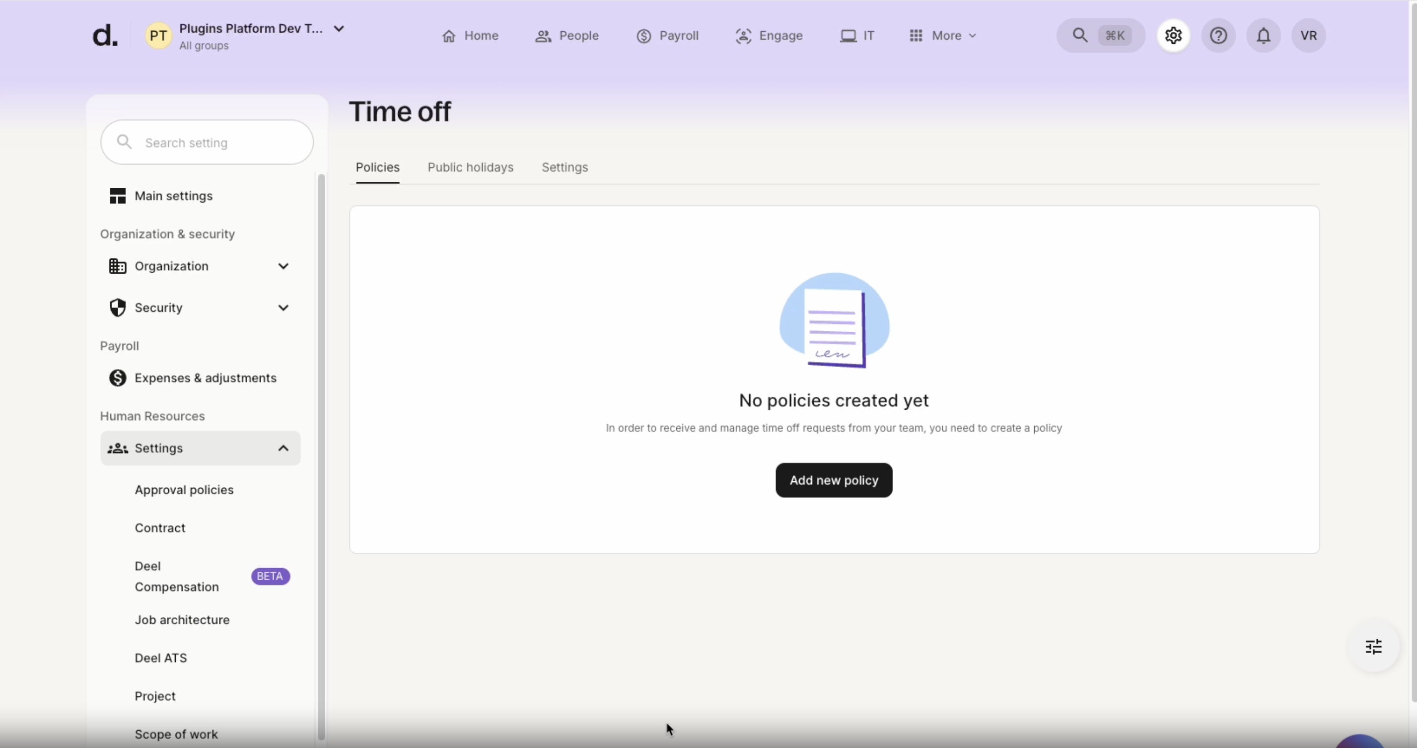 Go to Org Settings > Time Off > Policies, then click Add new policy.