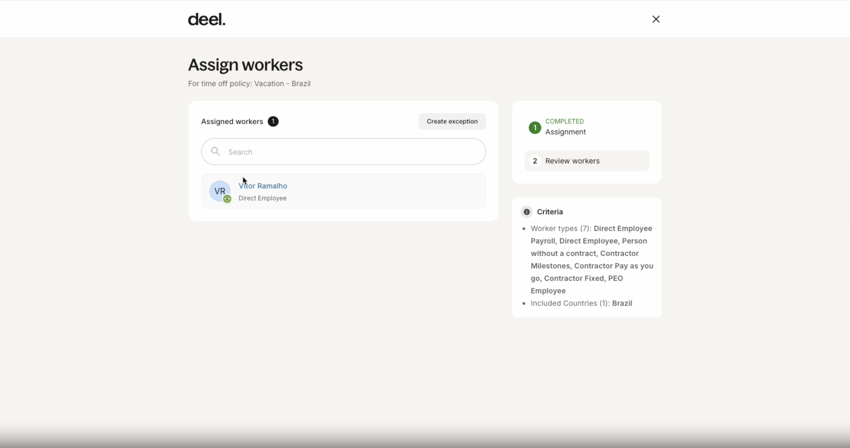 Once assigned, workers will see their time-off balance and can submit requests directly in Slack or Deel.