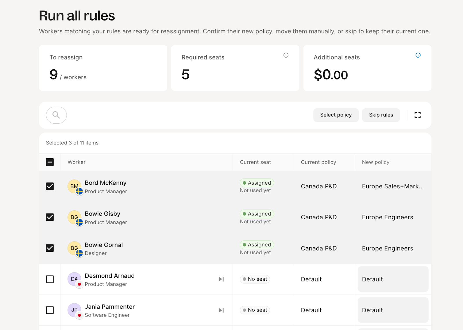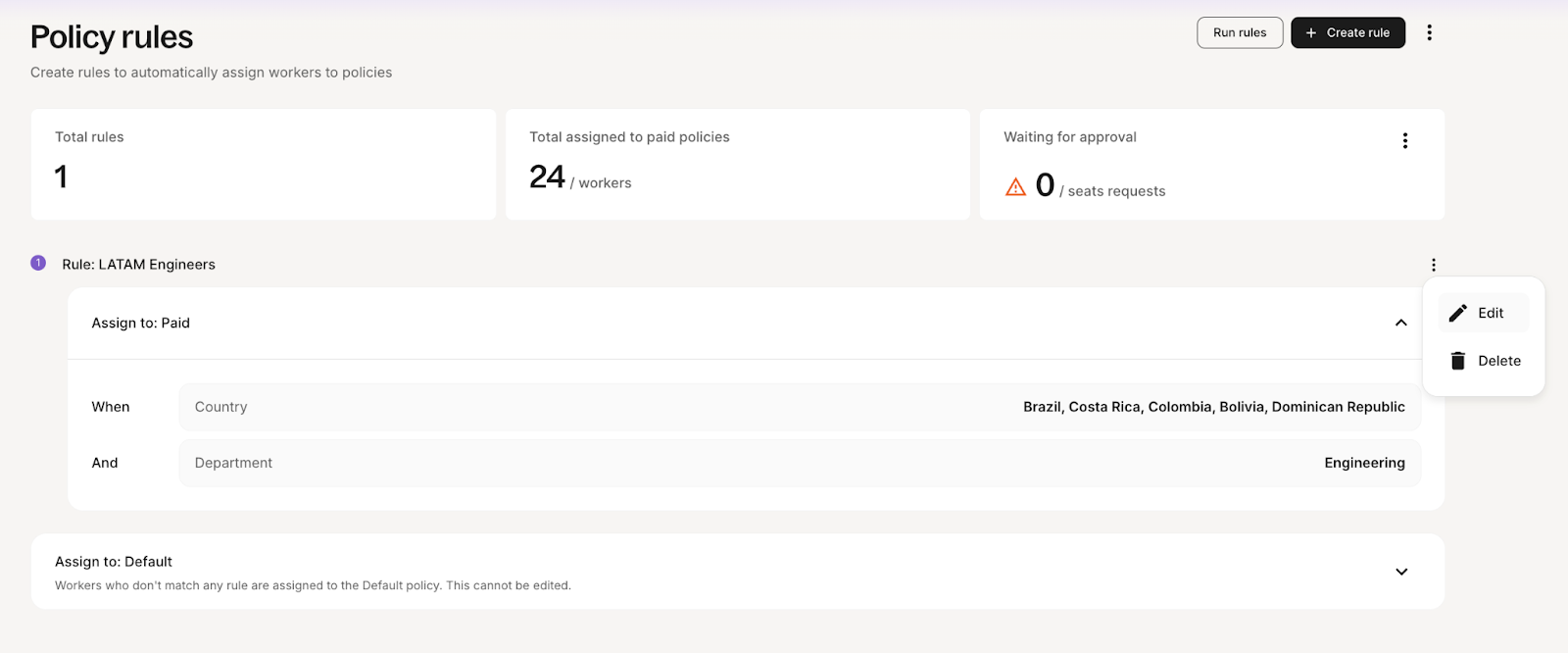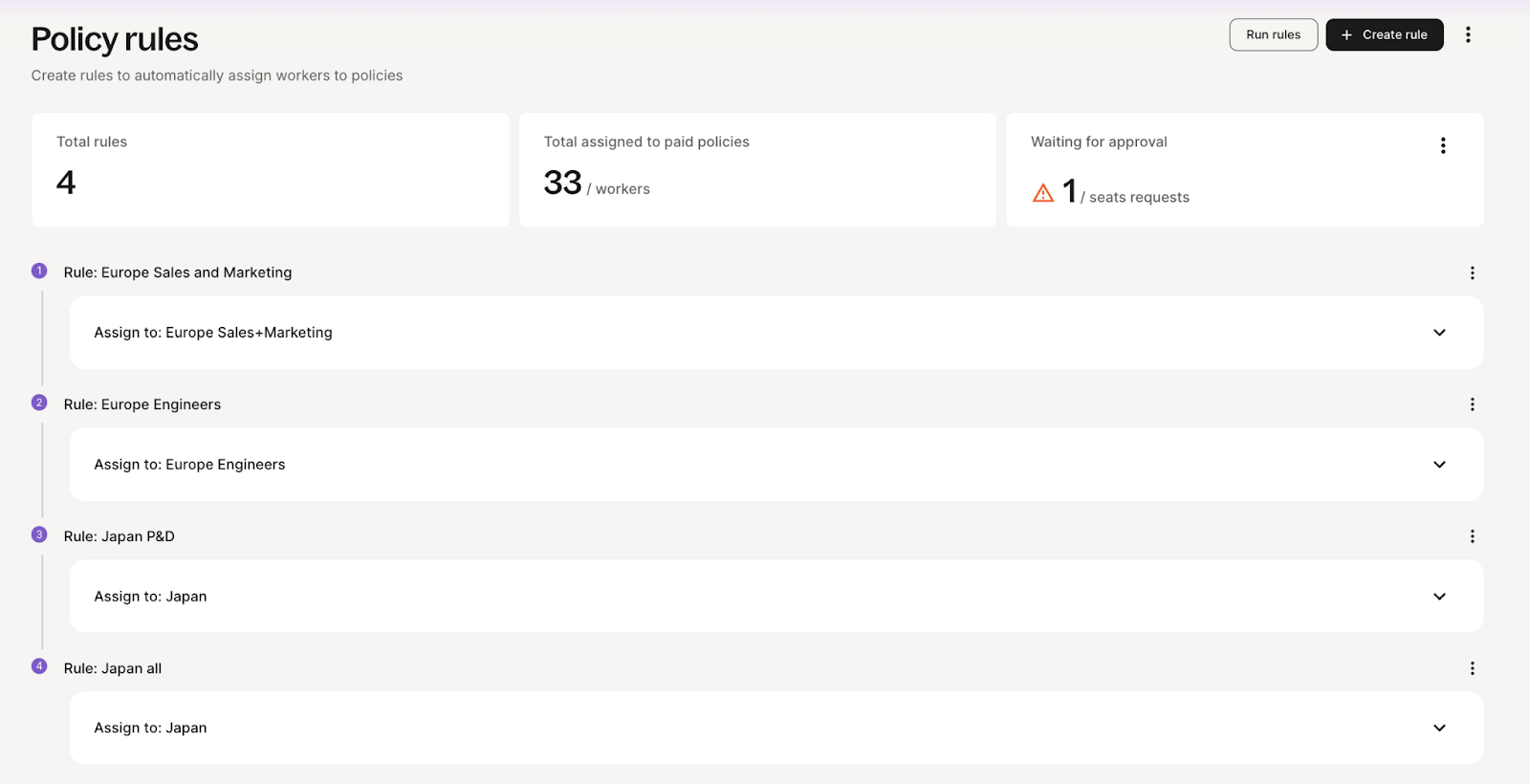 Instead of manually assigning workers to policies or risking errors that can affect seat usage and costs, you can create smart rules that automatically place workers into the correct policy from day one. This saves time, improves accuracy, and streamlines onboarding and seat management.