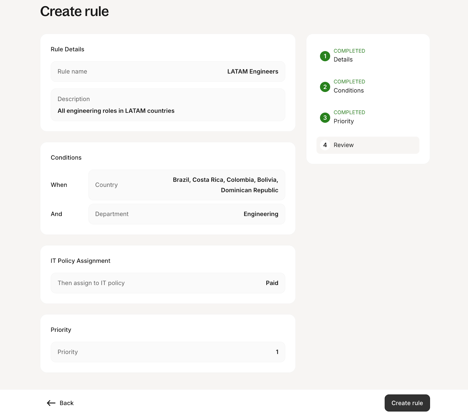 - Review: Check all the details of your rule one last time (Name, Conditions, Policy, Priority).