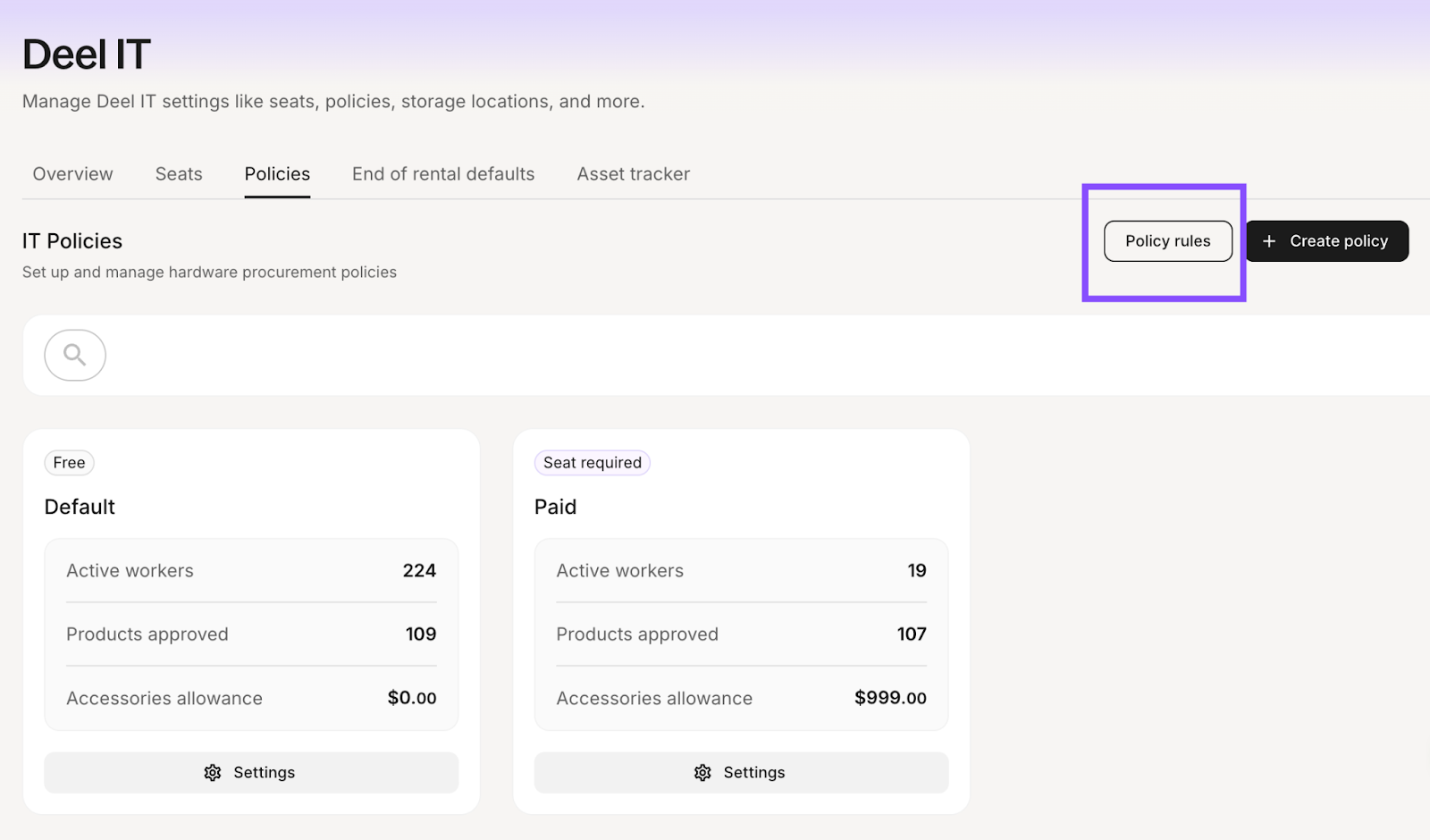 You can find the Policy rules configuration in your Deel IT settings.