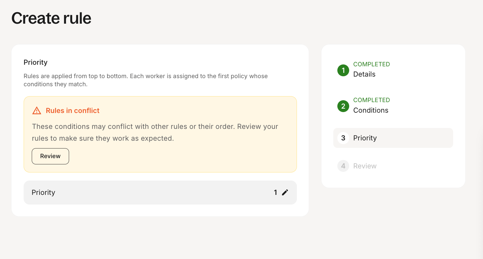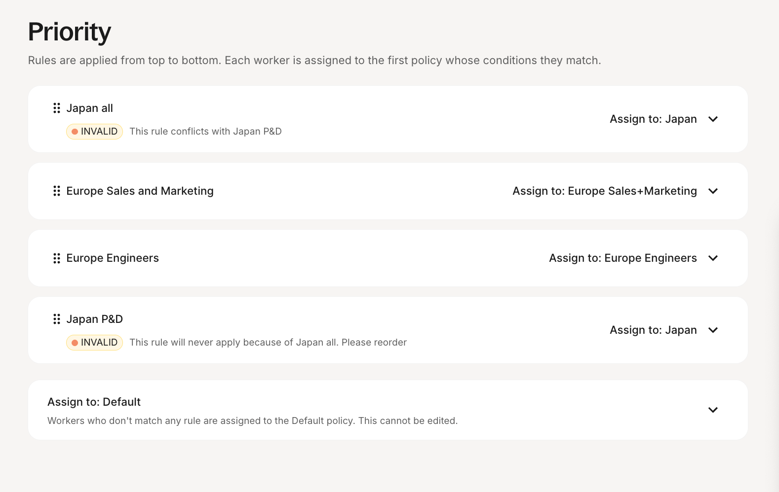 Priority: Rules run in order from top to bottom. A worker is assigned based on the first rule they match.