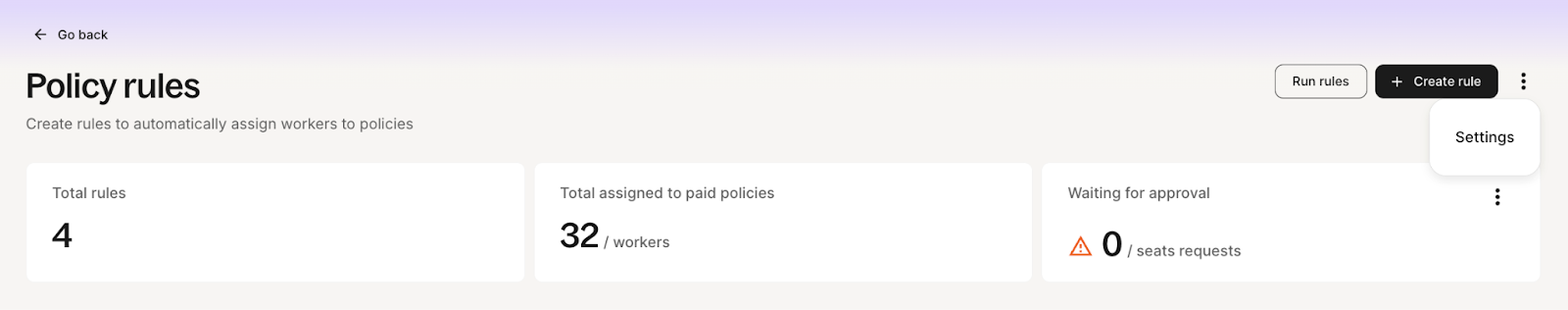 This takes you to the main Policy Rules overview page. Here you'll see a summary (like total rules active, workers assigned to paid policies) and a list of your configured rules ordered by priority. Which means the rules will be applied top down - the worker will be assigned by the first rule they match.