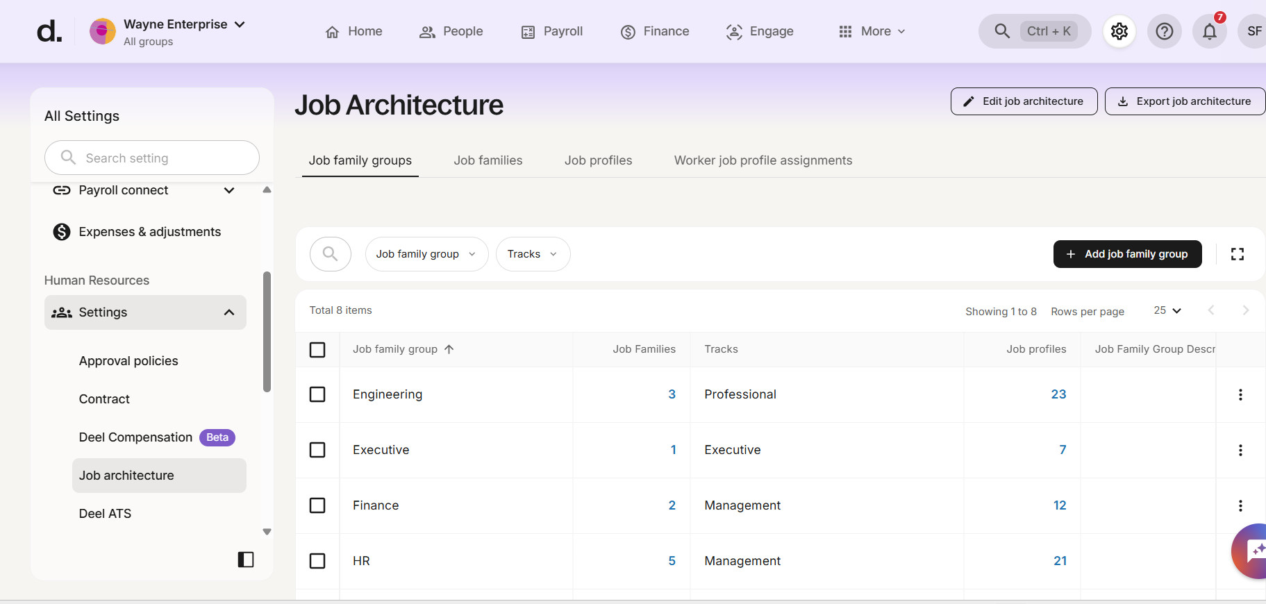 In Deel Compensation, job architecture refers to the organized structure of job positions and levels within a company.