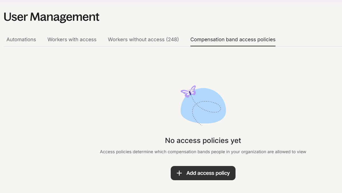 Navigate to “Compensation band access policies” within User Management. You can add up to eight access policies based on a combination of job architecture and markets.