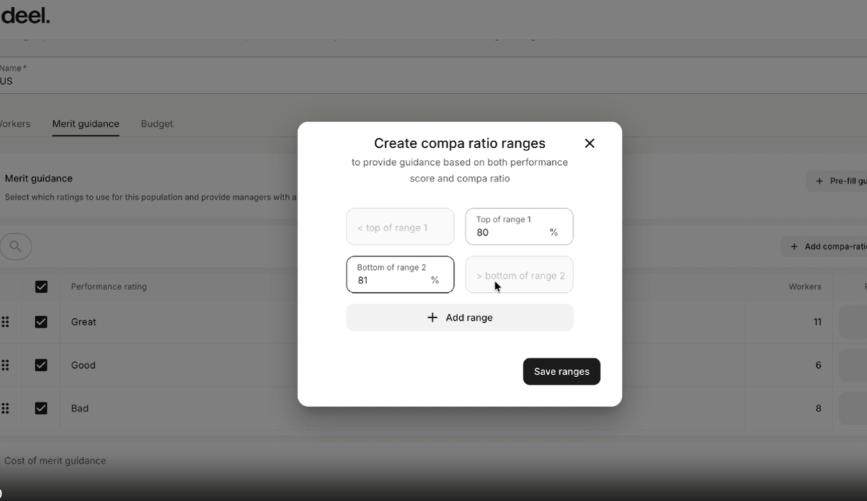 Select Merit guidance > Add compa-ratio ranges. Click add range to begin, and enter values for top and bottom.