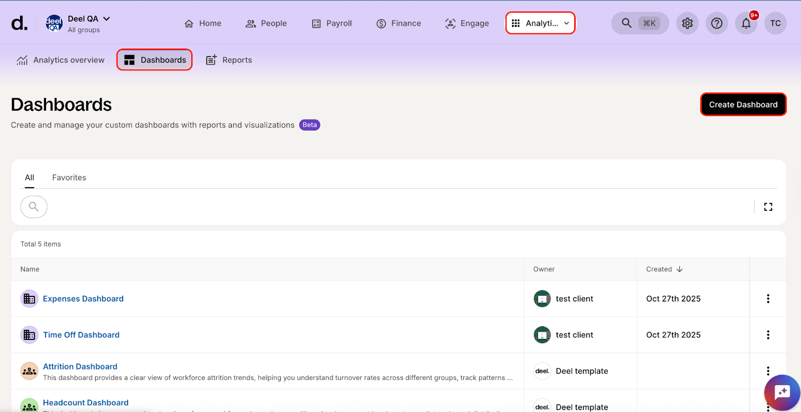 This article explains how to create dashboards in Deel Analytics 2.0 so you can organize visualizations, monitor key metrics, and share insights with your team.