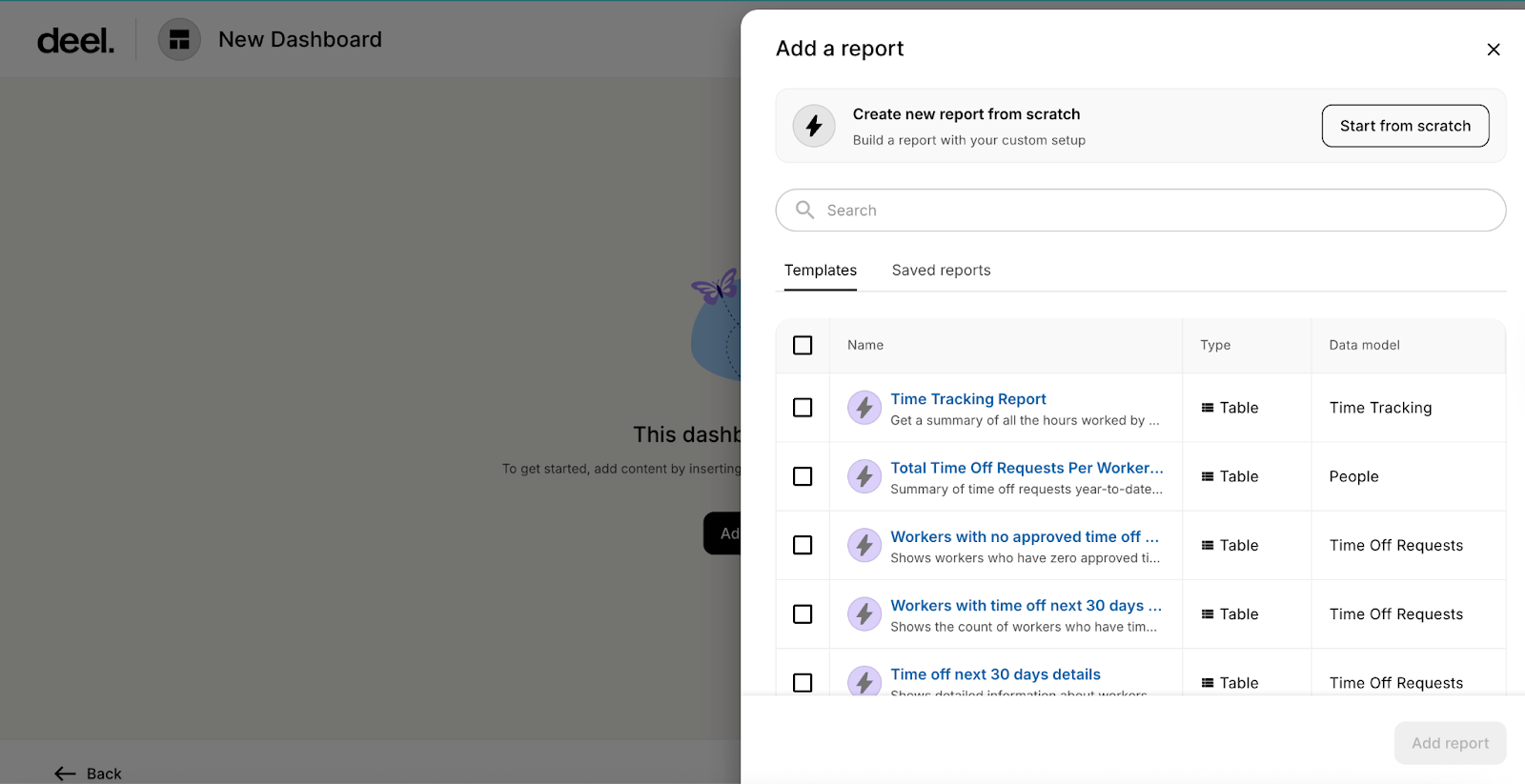 - Add a report from templates: Use a preconfigured report built from Deel templates that automatically load your organization’s data.
