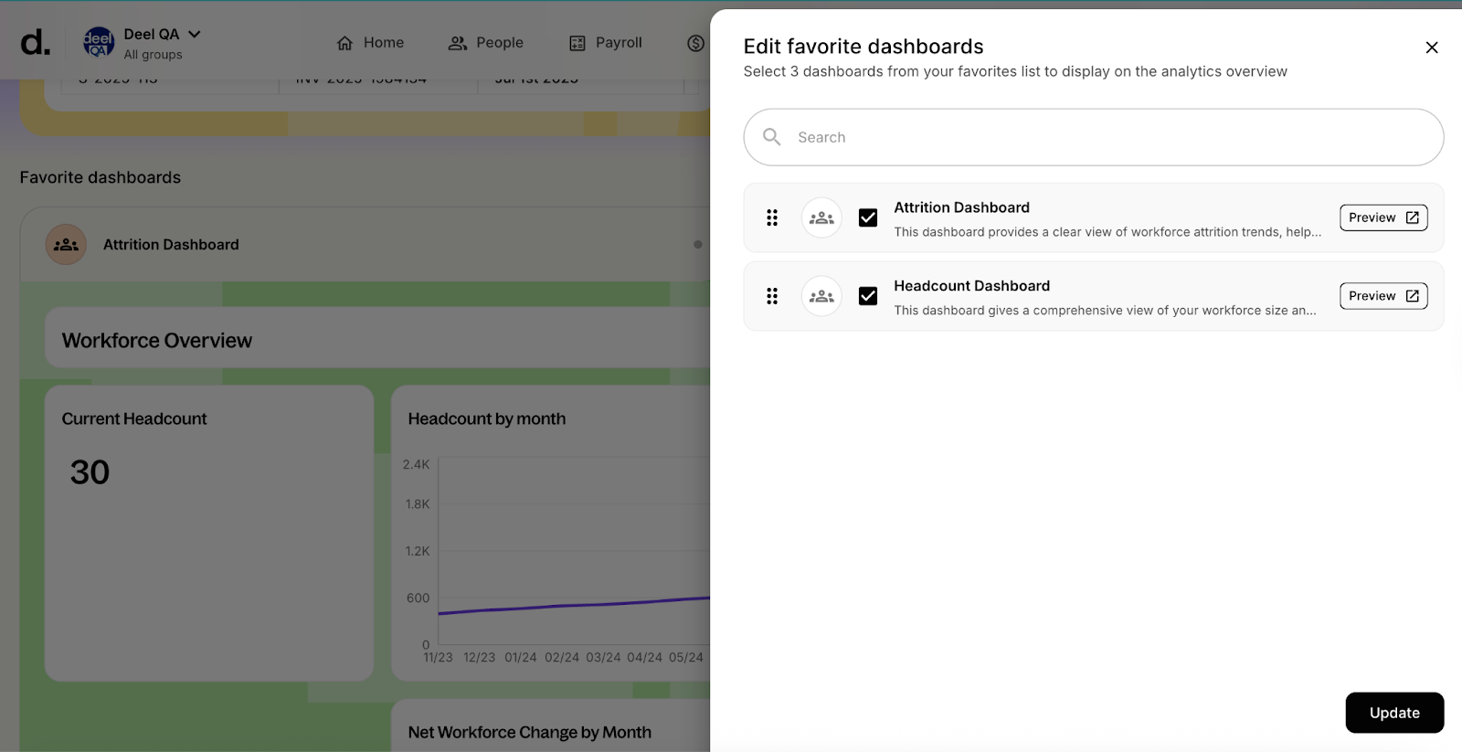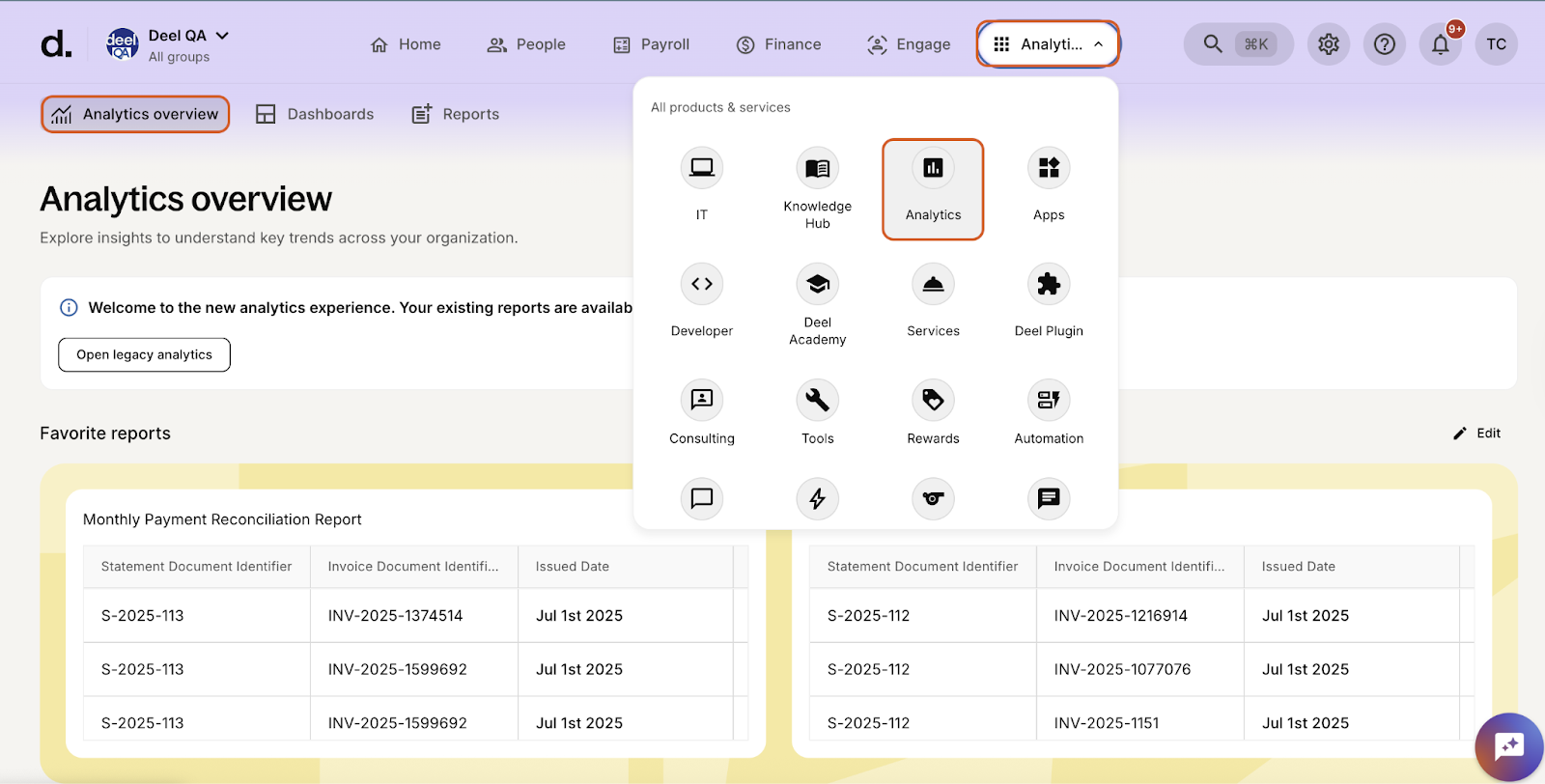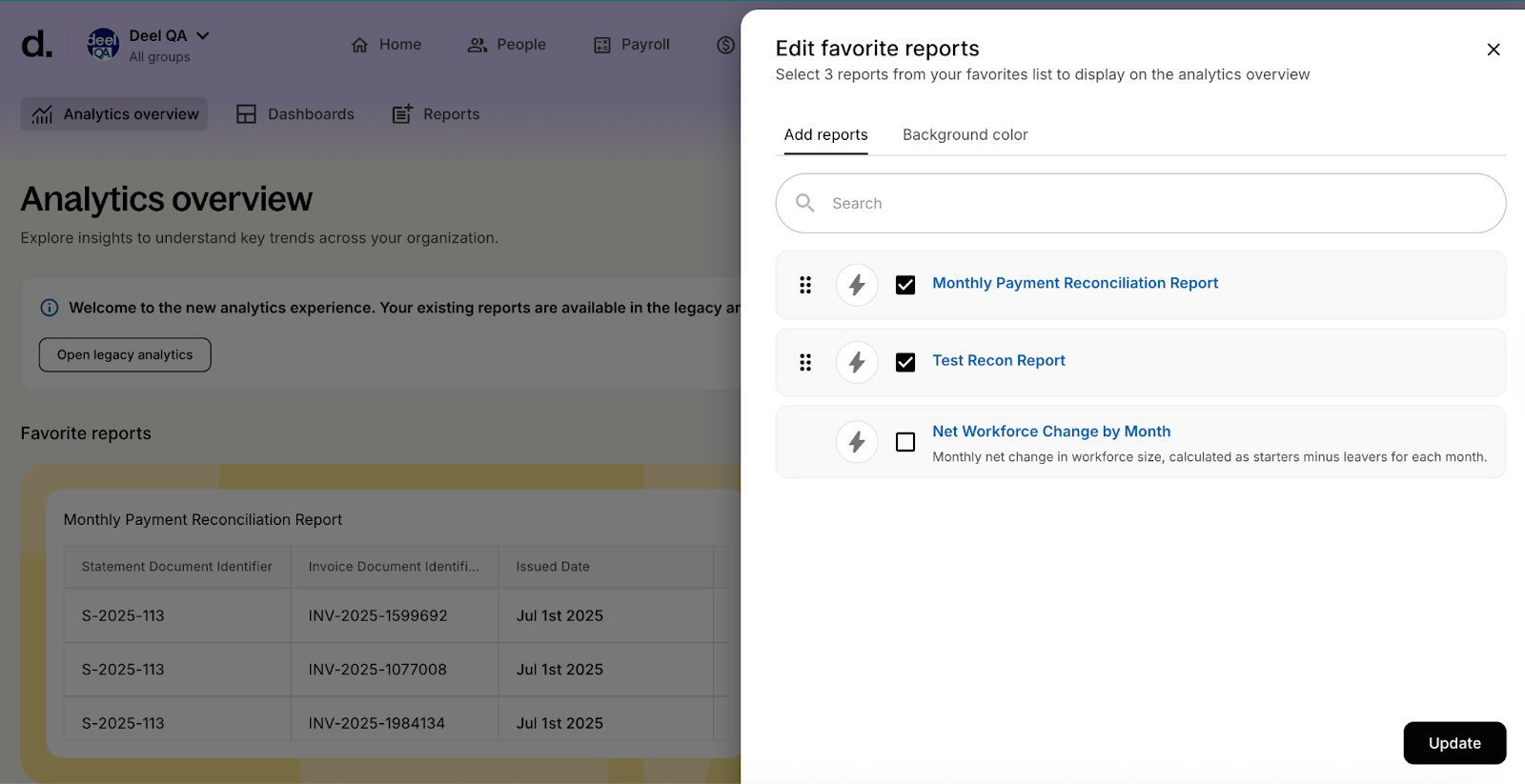 This article explains how the Analytics Overview page works in Deel Analytics 2.0, including how to access it, customize it with your favorite reports and dashboards, and use it as your central landing page for insights.
