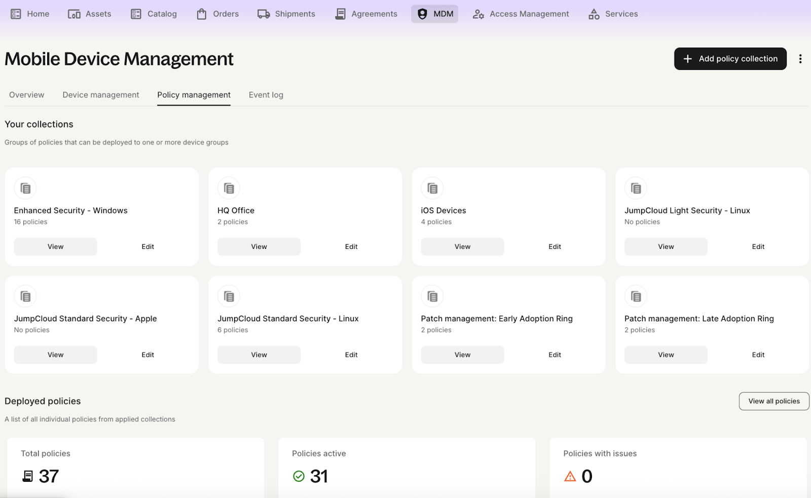 The Policy Management tab allows you to create, manage, and apply security policies to your devices through "Policy Collections".