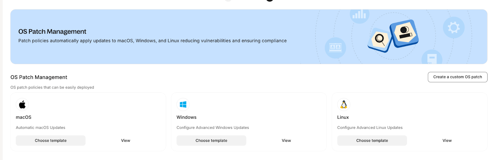 You can also create OS Patch Policies in a very convenient way. These Patch policies automatically apply updates to macOS, Windows, and Linux, reducing vulnerabilities and ensuring compliance, flexibly: from time windows to notifications, enforcement policies to builds.