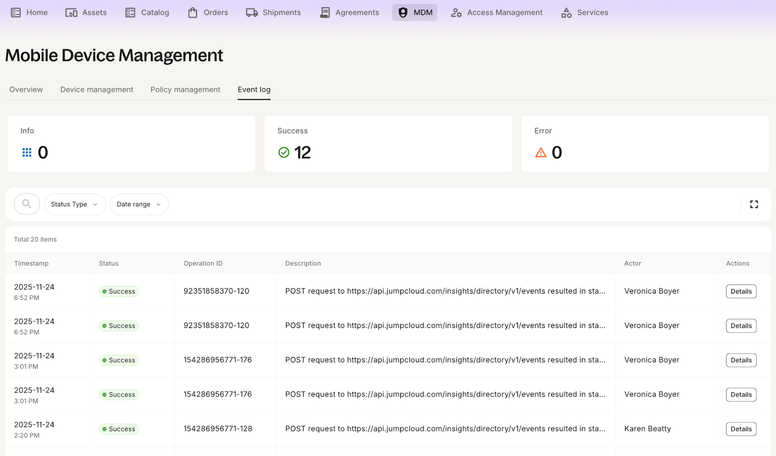The Event Log tab provides a comprehensive, real-time record of all MDM actions and API calls. It is a powerful tool for auditing, troubleshooting, and verifying operations.