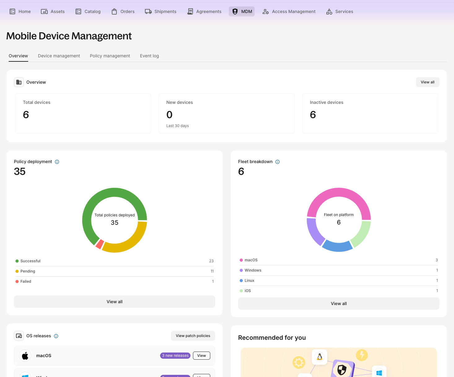 - Recommended for You: Provides tips and 1-click policy collections to help you secure your fleet, such as enforcing patch policies.