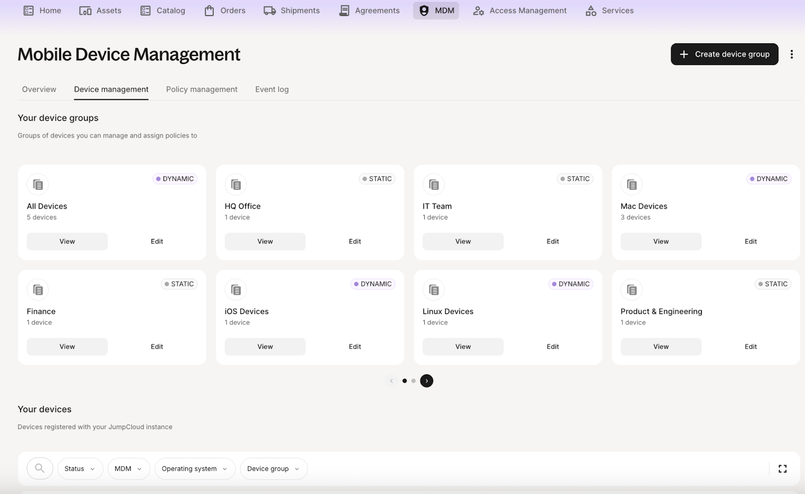The Device Management tab gives you centralized control to group devices, apply policies, and perform remote actions. It is possible to get more information on a single asset (including performing actions - like wiping, locking, or restarting the machine), or to explore device groups, with associated policies.