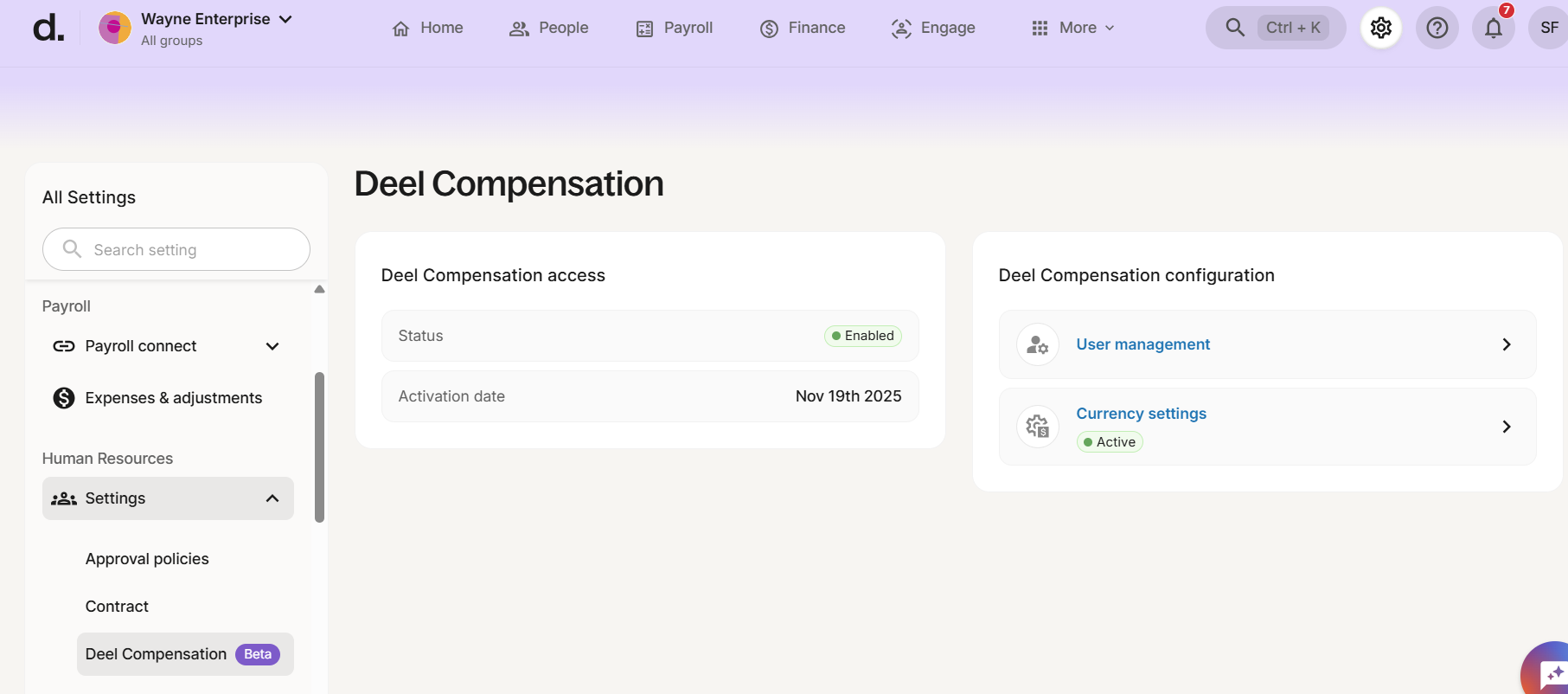 Select the Org Settings (gear icon) > Settings tab > Deel Compensation.