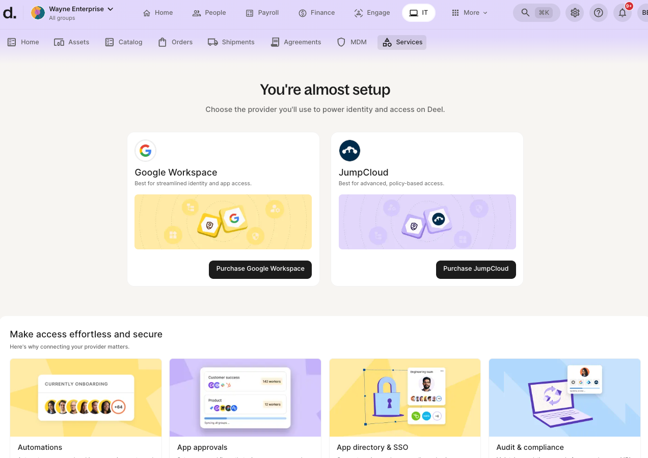 From the Deel homepage, go to IT > Services > Access Management. Click Purchase Google Workspace for the Google Workspace option.