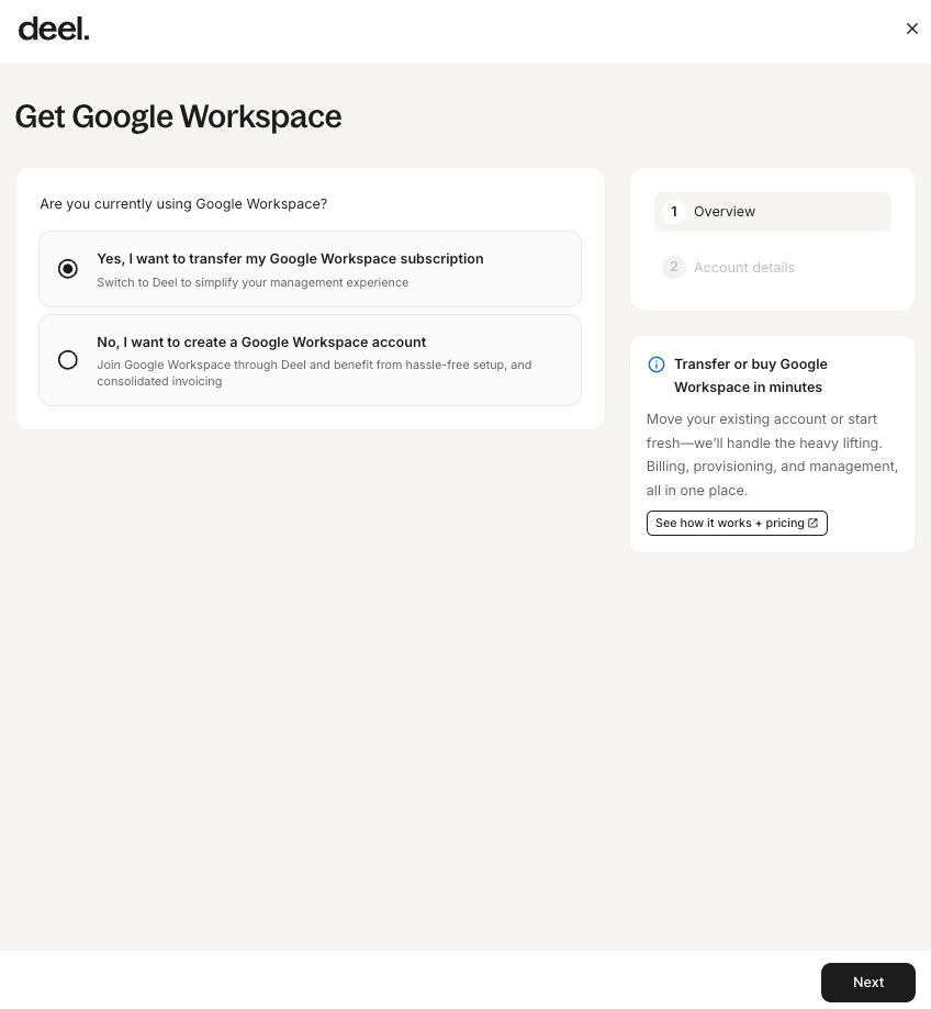 Note: If you already have a Google Workspace account, you must transfer it to Deel to use this feature. You can find more information in the Google Workspace resale integration guide article.