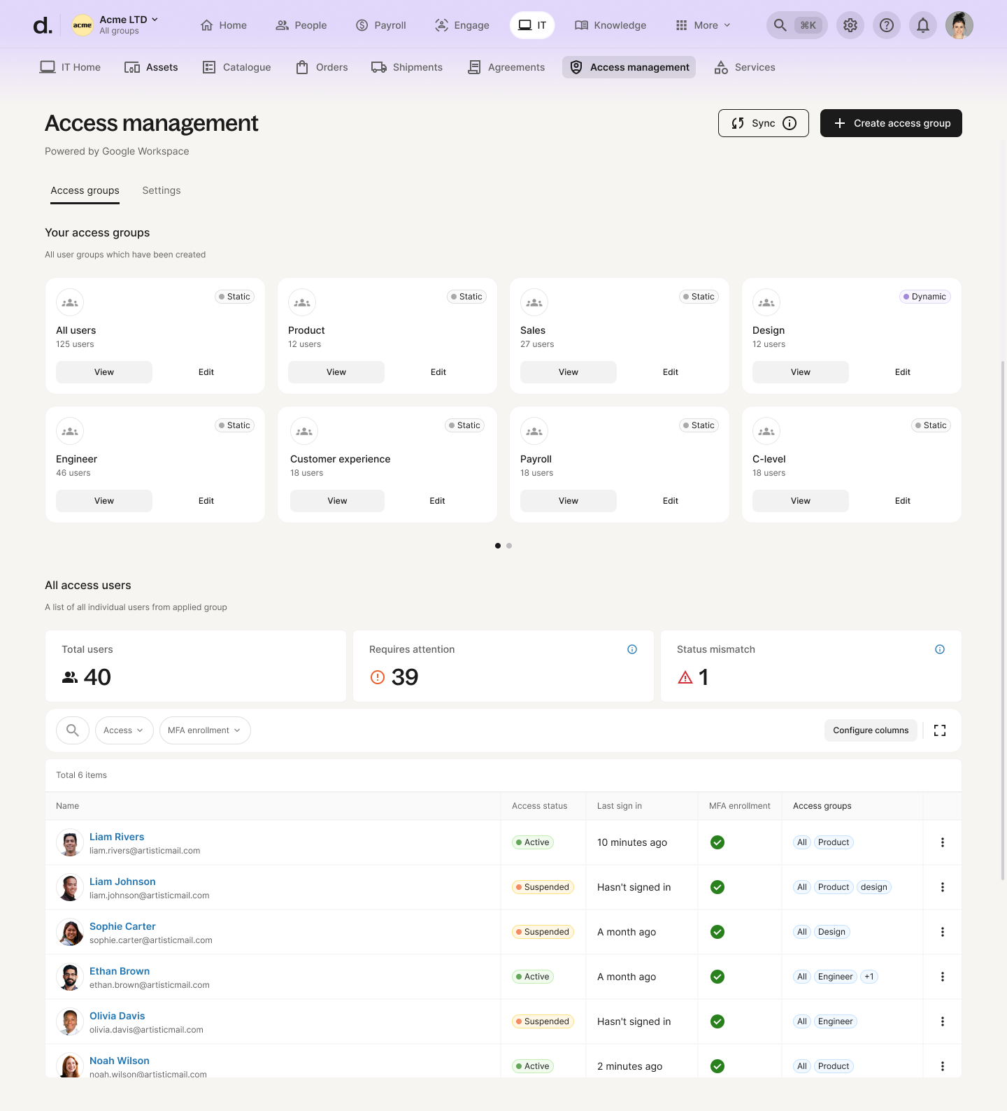 Once a group is created, you can view all users and their access details from the Access Management tab, including: