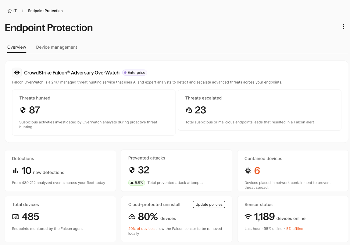 CrowdStrike Falcon gives you real-time threat detection and endpoint security visibility and can be integrated with the Deel platform, surfacing insights to your Deel IT suite. Protect your organization from advanced threats, whether you want Deel's team to keep an eye on your instance or you prefer to maintain full control yourself.