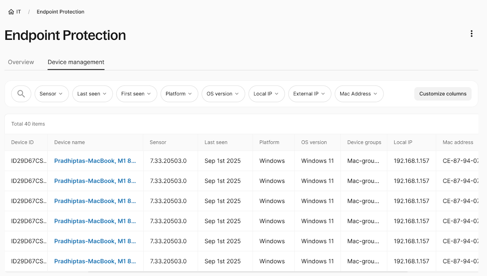 The device management tab lists all your managed devices with details, including: