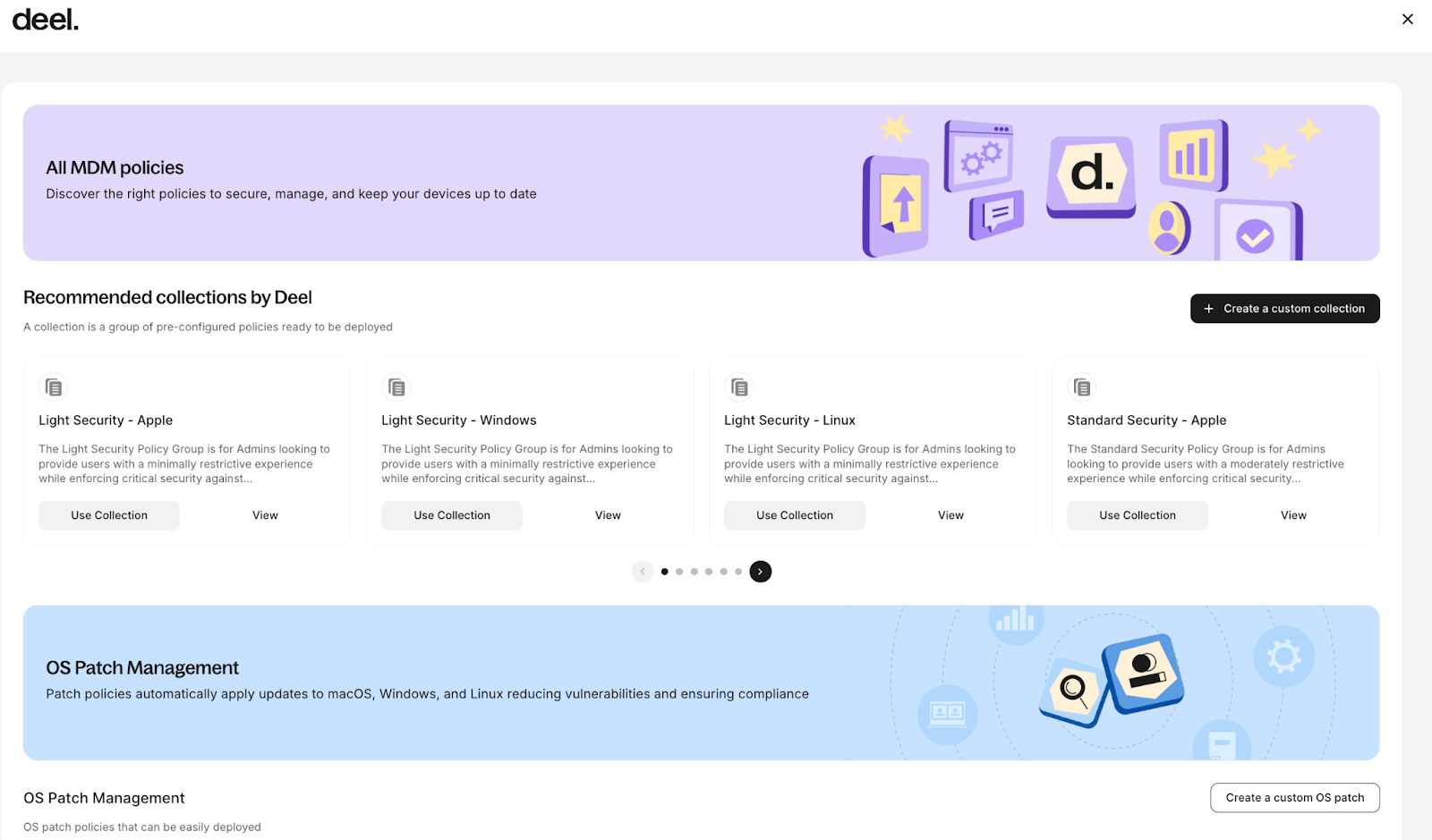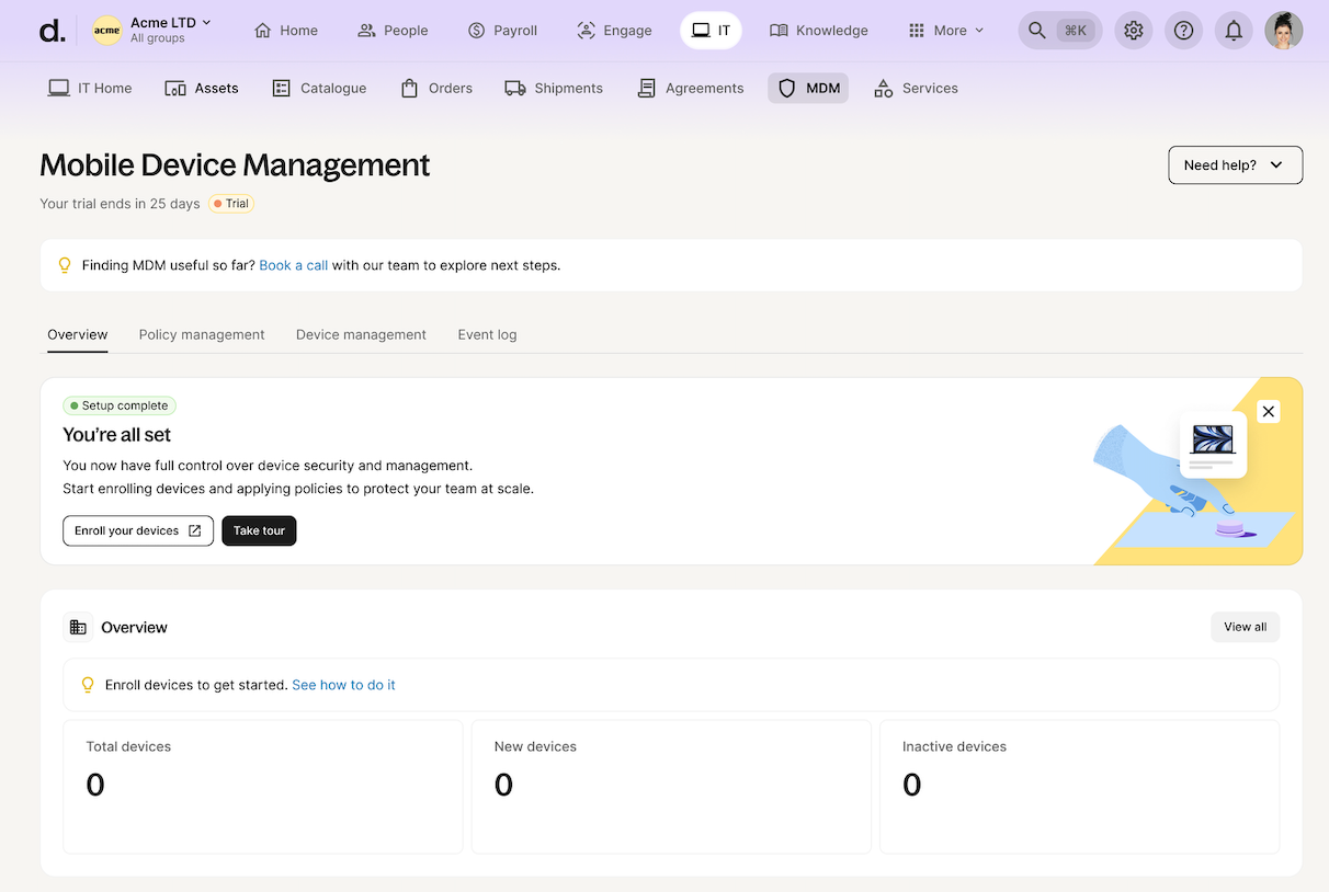 The MDM trial is your opportunity to explore the full potential of Deel's IT Mobile Device Management without immediate commitment, helping you decide if our solution is right for your organization. For 30 days, you will have access to all the functionalities available on the product, which combines state-of-the-art endpoint management with synergies with other areas of the Deel platform, such as HR or Access Management.
