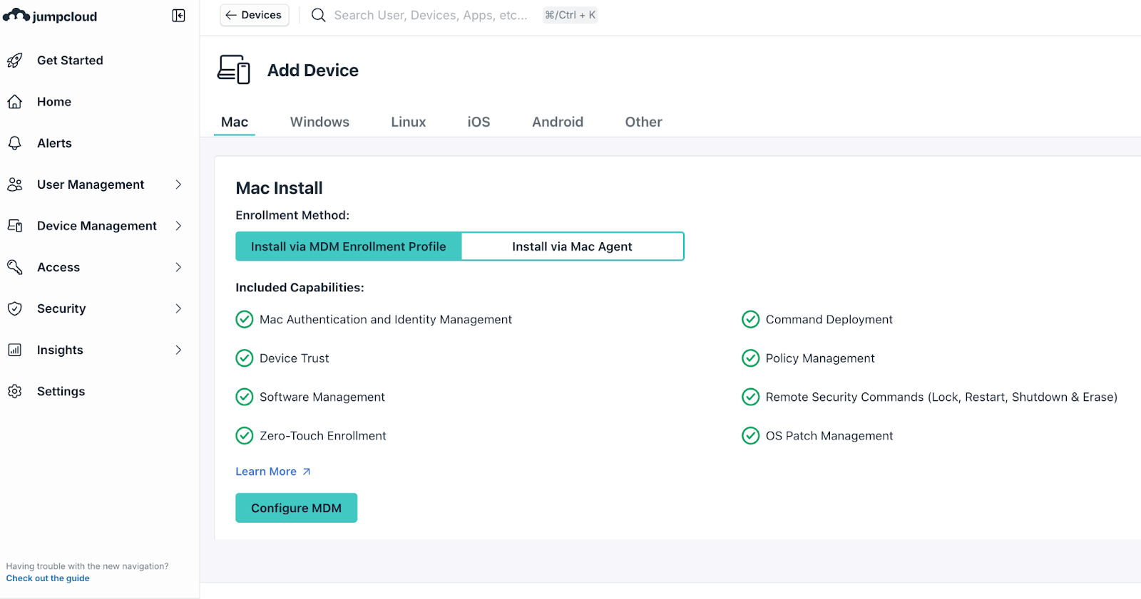 Apple requires a secure handshake between JumpCloud and your Apple Business Manager account, so you can enroll Mac devices. For this, you must create an MDM enrollment profile and then have the enrollment certificate downloaded and installed on your devices. This security mechanism provides an additional layer of compliance to your devices.